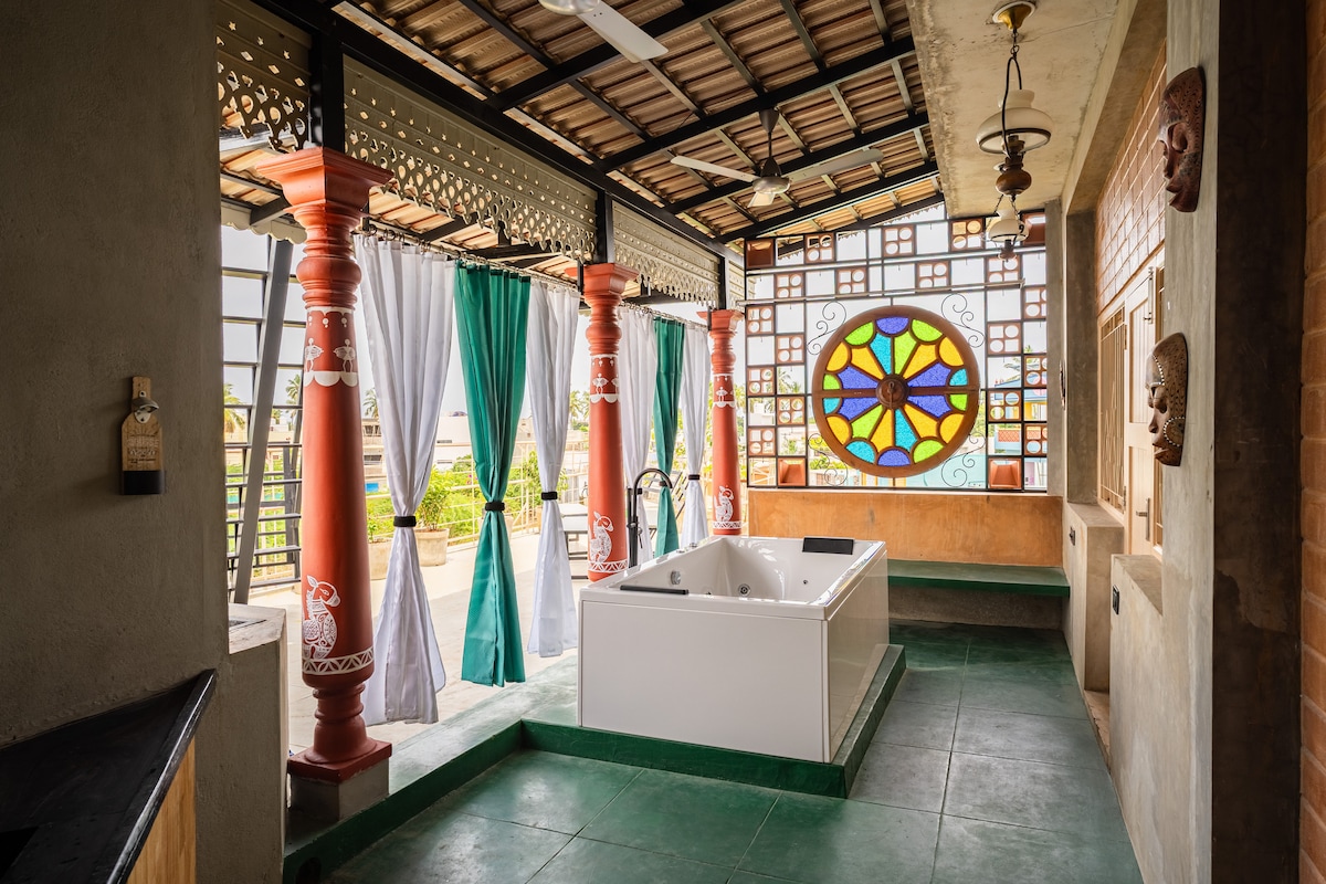 La Plage is a Ultra luxury stay just 100m (3-min walk) from Pondicherry Beach & next street to White Town 🏖️. Soak in relaxing a private 🛁 2-person Jacuzzi, glowing onyx bar 🧱, 🎬 120” projector with Dolby sound, 🌐 1000 Mbps WiFi & 18 OTT apps like Netflix 📺. Relax in the 🌿 serene backyard garden — kid-friendly & peaceful. Just 8 mins (550m) from Sri Aurobindo Ashram 🕉️. Perfect for romantic getaways, beach lovers & movie nights. Your Pondy escape awaits! Hidden gem in the heart of Pondy