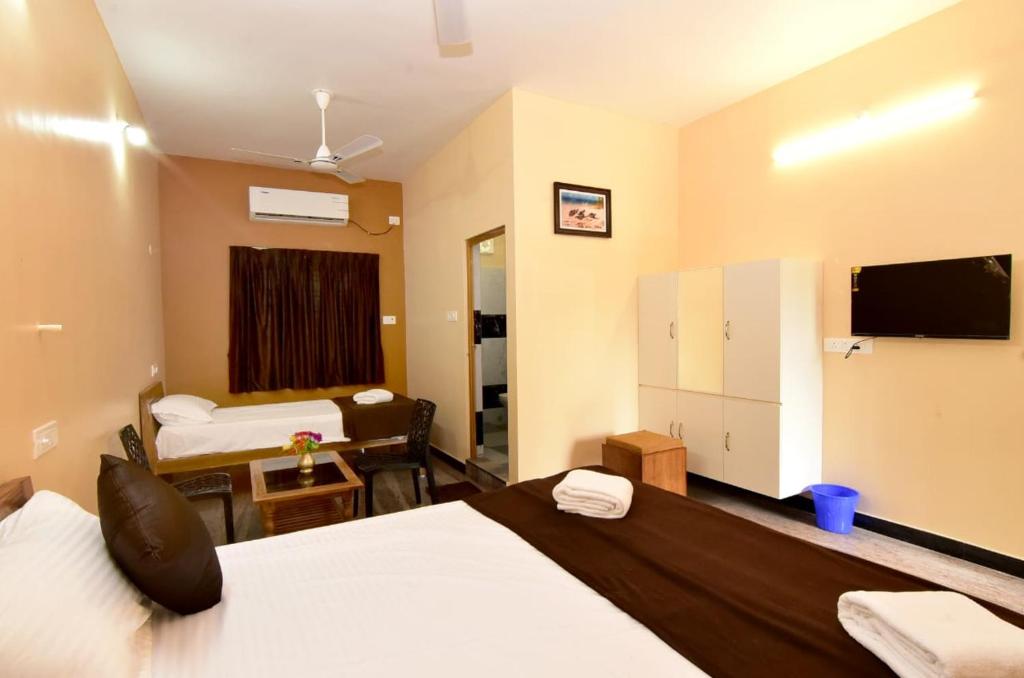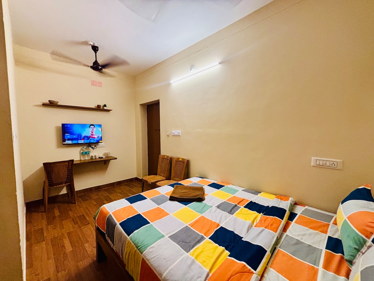 One double bed bedroom with AC, Geyser, WIFI, TV and attached private bathroom. Minimum 1 Adult, Maximum 2 Adult and kid can be accommodated. Situated at prime location, easy access to bus station, railway station and beach. lots of eateries and shops around.