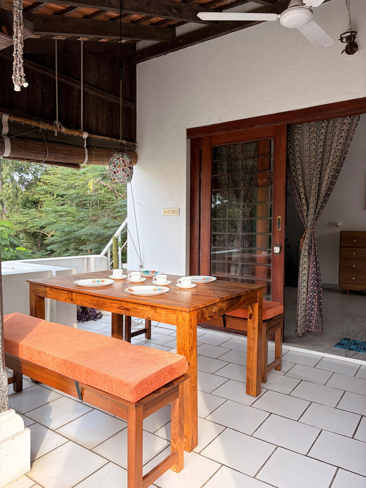 Entire ground floor of a 2 floored home. A serene property surrounded by lush greenery; well-lit and ventilated rooms; common space with large French windows. Enjoy the breeze and amazing view from the vast sit out and terrace spaces. Very good wifi facilitating work from home, book collection, board games and other engaging amenities to have a good time. Auroville beach and Serenity beach at a walkable distance (500m). Both beaches are ideal getaways for surfing, kayaking and fishing.