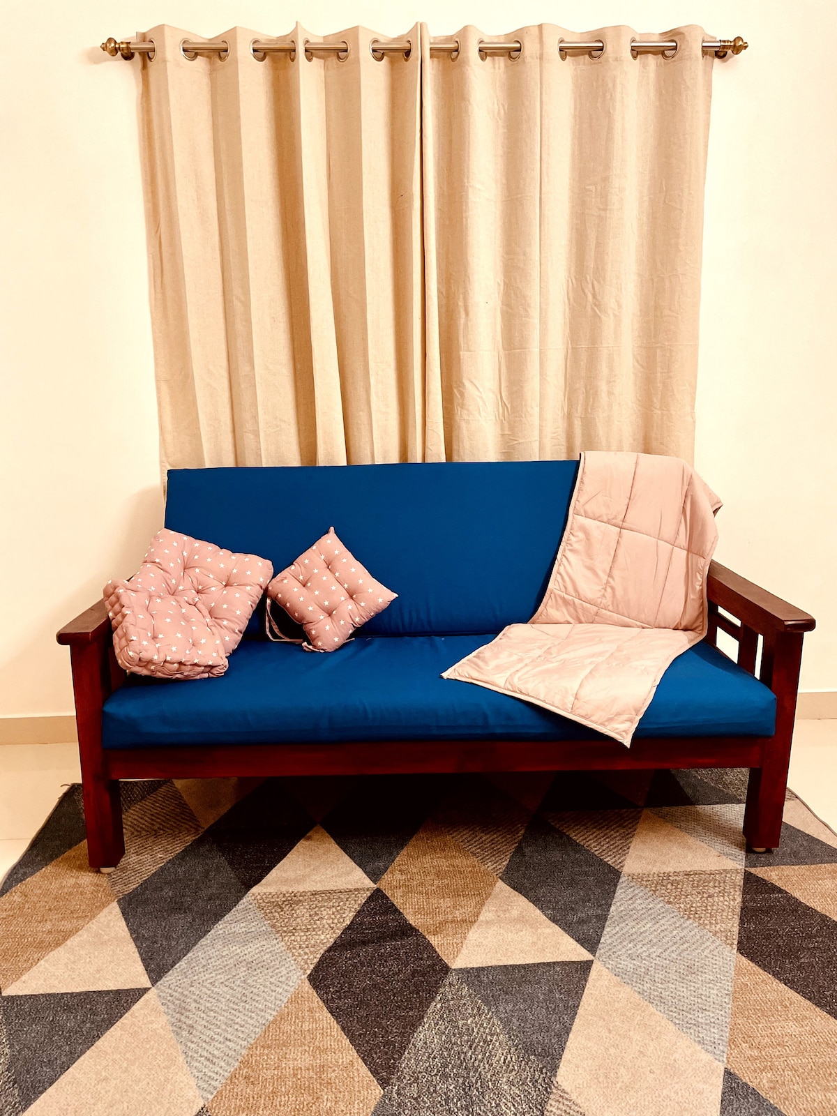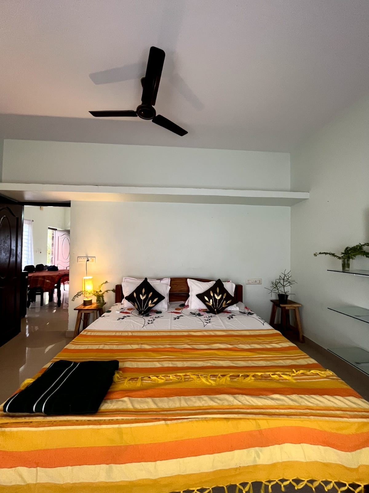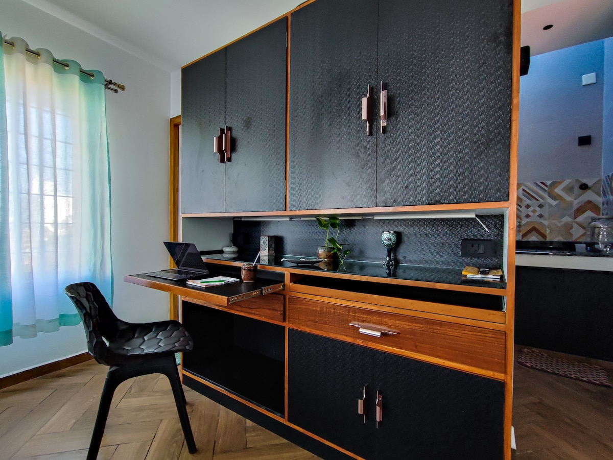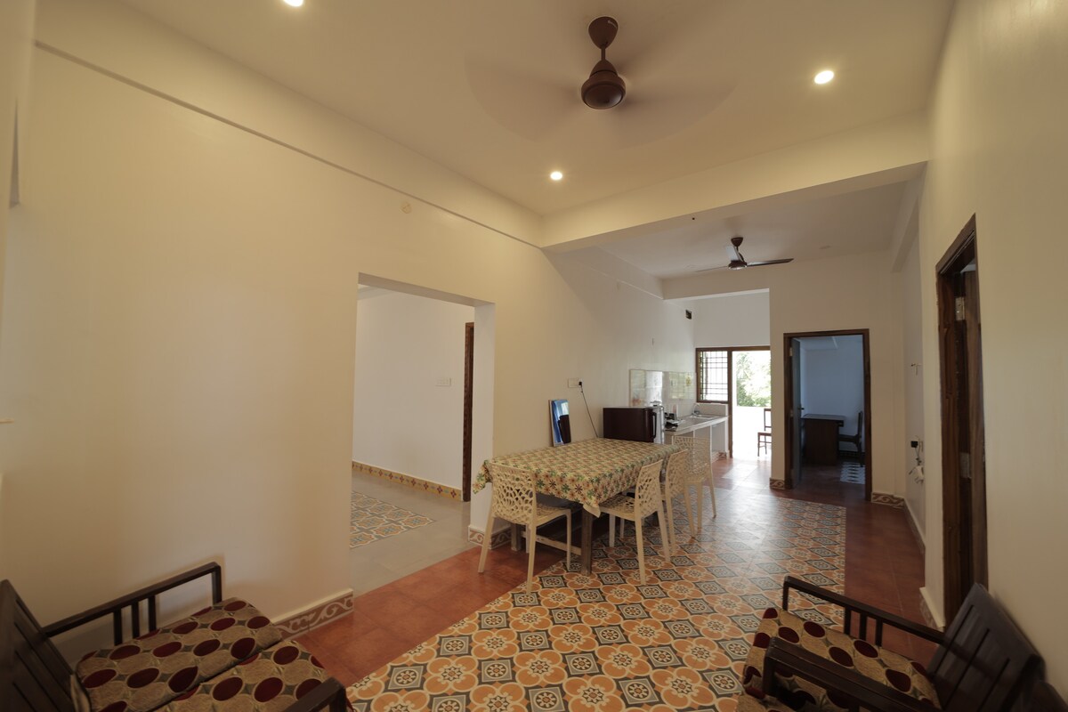 Your home away from home in Auroville has been tastefully decorated to a Chettinad theme. Every corner of our home is Instagramworthy with colourful interiors, kolam art, antique decor and more. The 1BHK can comfortably accommodate up to 4 persons with a swing bed and sofa bed in the living room. hile there are plenty of restaurants nearby, our kitchen has been thoughtfully equipped for all your needs - be it to make a quick omelette or a full Indian meal. So sit back, relax and sip your coffee.