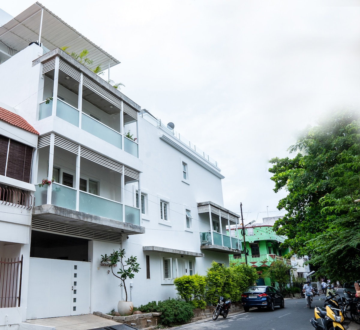 The Penthouse Studio Apartment on the 3rd floor in Mel Ville is tucked in a quiet residential neighborhood, albeit conveniently located in the heart of old Pondicherry. It is a luxuriously furnished & well ventilated single dwelling (550 Sq Ft ) Includes a terrace (300 Sq Ft) and a Sun Deck (400 Sq Ft ) Amenities include > Wardrobes / Dresser / Side Tables, Air Conditioning, WiFi, Drawing / Dining space, Large screen TV. The Kitchen is fully equipped with necessary appliances.