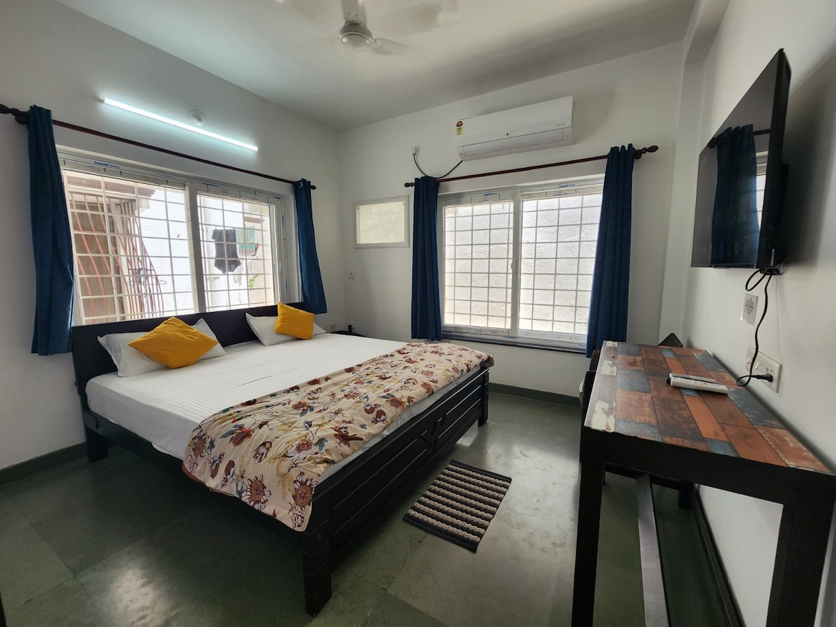 Completely Private with no sharing of any space, One Studio Room Small Apartment with a slab for kitchen & attached bathroom. New AC, cupboard, Queen bed with orthofoam mattress, ideal for two guests. kitchen area contains induction for cooking with utensils and cooking vessels. Hi-speed Internet connection for work from home Google TV with all Apps, AC, Fridge, Oven, Geyser, chairs, iron, etc, everything is there. Fully entilated place with 2 big windows. We need ID proof of all guests.