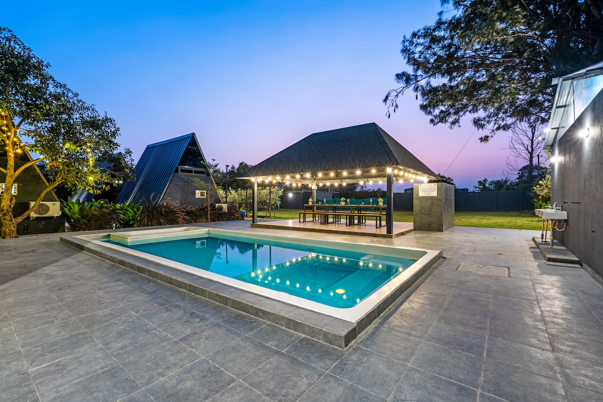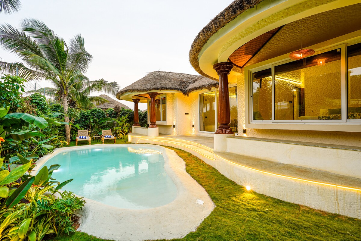 Discover this Bali-inspired single-suite retreat in Mahabalipuram, just moments from the sea and UNESCO landmarks like the Shore Temple. Nestled in lush tropical greenery, the 300 sq. ft suite features a king-sized bed, a vaulted thatched ceiling, AC, TV, and a private garden with a 600 sq. ft. plunge pool. With earthy stone finishes, ambient lighting, and intimate common areas including a lawn and thatched gazebo, the property offers a serene tropical escape blending luxury with cultural charm