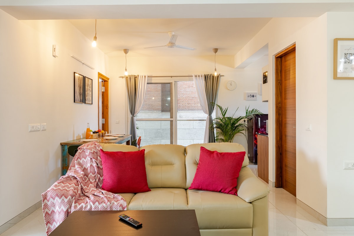 Spacious 600 square feet Designer 1BHK Suite with Private Balcony | High-Speed fibre optic Wi-Fi & Smart TV with streaming platforms, Work/Dining Desk, 24/7 power backup for uninterrupted work and comfort |Luxe King Bed & Orthopaedic Mattress ,wooden wardrobes for storage | fully equipped Kitchenette | Couch Bed in living room , Max.Occupancy 4 | Elevator access, professional housekeeping and access to paid laundry on site for long stays| Located in Central Bangalore | LGBTQIA++ Affirmative