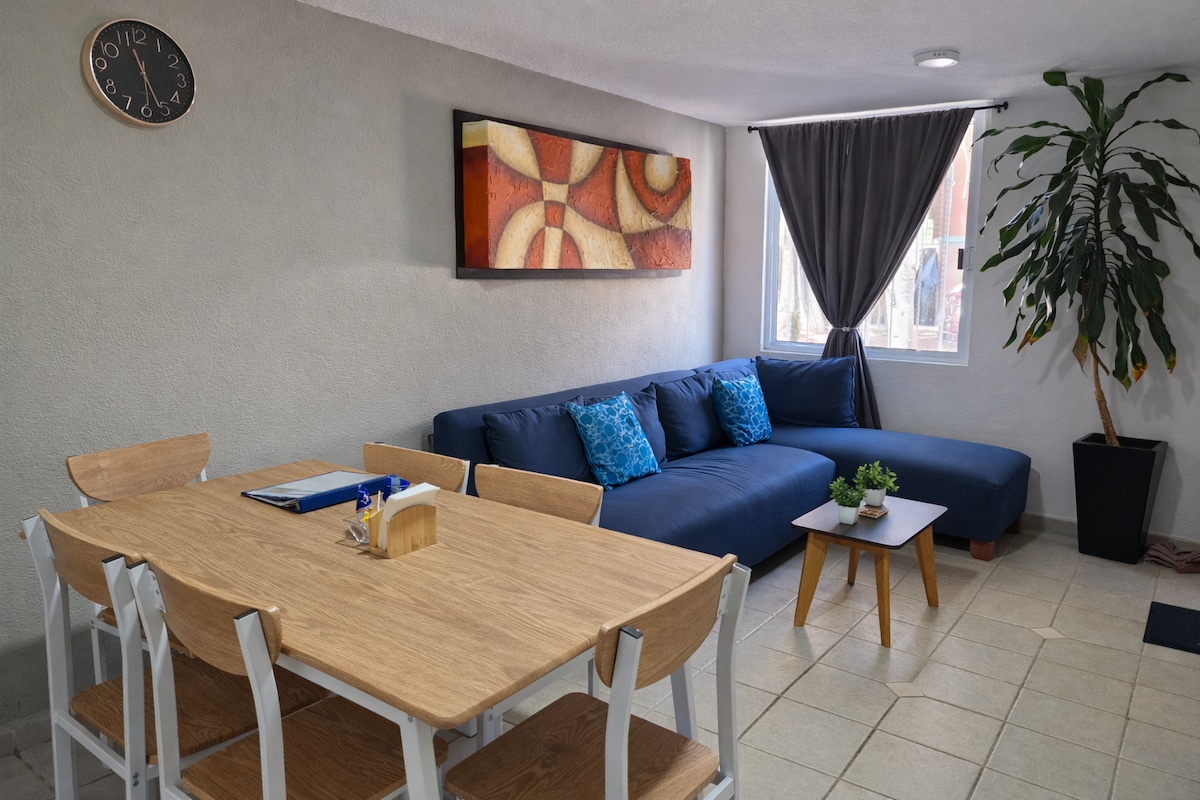 A furnished two-story condominium with Wi-Fi, living room, dining room, equipped kitchen, and refrigerator. A small office with a small full bathroom on the first floor, and the second level has a full bathroom with a shower, hot water, and three bedrooms. You have access to a covered gated parking space. The apartment has all the essential elements in a home ready for use. Enjoy a family atmosphere in a house centrally located and 6 minutes away from the "Convention Center Puebla" and downtown.