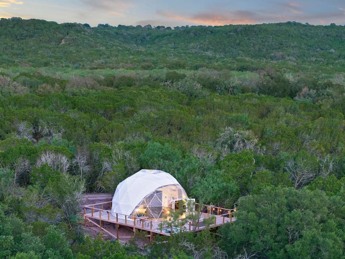 Here at our Cloud Dome you'll be away from the hustle and bustle in a stunning hill-county Geodome! Take advantage of our outdoor spaces where you can enjoy a drink in the hammock bed, soak in the hot tub or indulge in your very own outdoor shower. Nestled in the trees on the edge of a small bluff your space has been carefully crafted to take full advantage of the surrounding nature all the while being in comfort and style! This luxury glamping experience is the perfect escape.