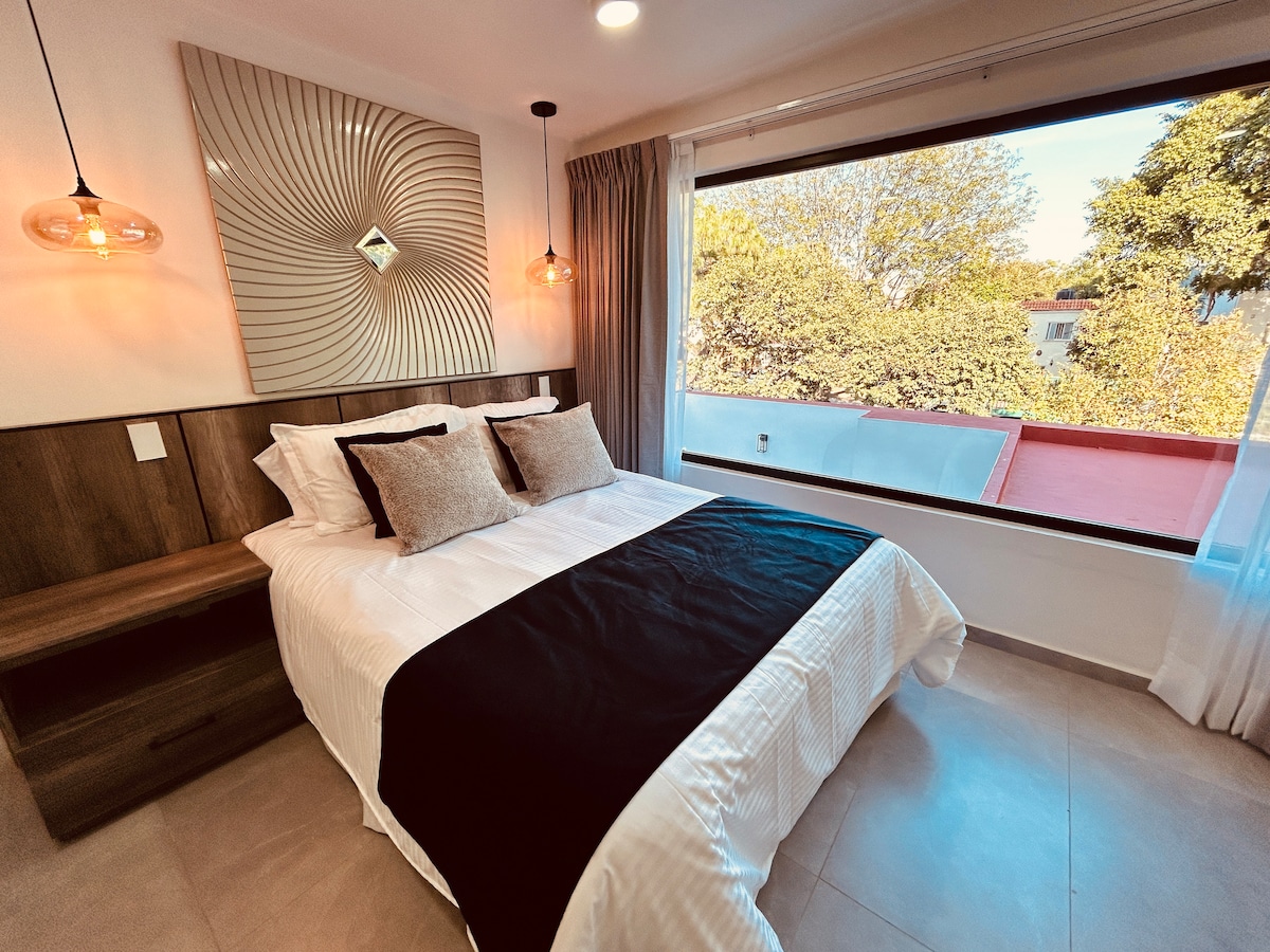 MORADA LIVING Estudio acogedor y funcional para viajeros que buscan comodidad y ubicación. Este espacio cuenta con cama queen, sofá cama, cocina equipada, Smart TV y escritorio ideal para home office. El edificio ofrece áreas comunes modernas y un ambiente tranquilo para descansar o trabajar. Ubicado en la Colonia Moderna, estarás a minutos del Centro Histórico, la Colonia Americana y el Parque Agua Azul. Una opción práctica y confortable para tu estancia en Guadalajara. ¡Te esperamos!