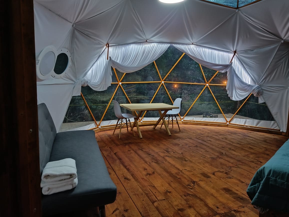 Habitacion domo inspirada en geometría y matemática sagrada. duermes en colchones inflables y hamacas arrullado por el sonido del bosque y río . al amancer aves, flora, fauna. aromas, colores, magnificas vistas y una tranquilidad que rodea al lugar- para 1 hasta 4 personas.