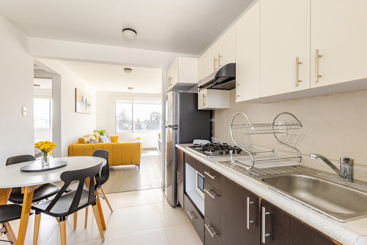 Bright, modern high-rise space on the 18th floor with open city views. Ideal for couples, friends, and relaxed longer stays 3 Queen beds for up to 6 guests Equipped kitchen Large-capacity washer and dryer machine Electric blinds and high-speed Wi-Fi for home office Enjoy a 24/7 GYM, rooftop, and in-building parking for 2 cars Pet-friendly building with security service and 24/7 security cameras Quick access to Cholula (5 min away), Angelópolis (8 min away), and key attractions