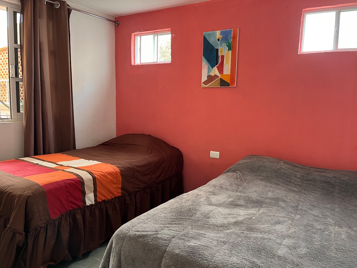 El alojamiento se ubica en zona sencilla y segura, en un tercer nivel. Una estancia abierta, completa, colorida y bien iluminada. Muebles con acabado rústico en madera natural. El baño ( con agua caliente) y la cocina son completos e independientes, con posibilidad de alojamiento para un tercer huésped en un sofá cama con costo adicional de $100.00. Estacionamiento opcional a una cuadra para autos compactos exclusivo del alojamiento con costo por noche. No apto para fumadores.