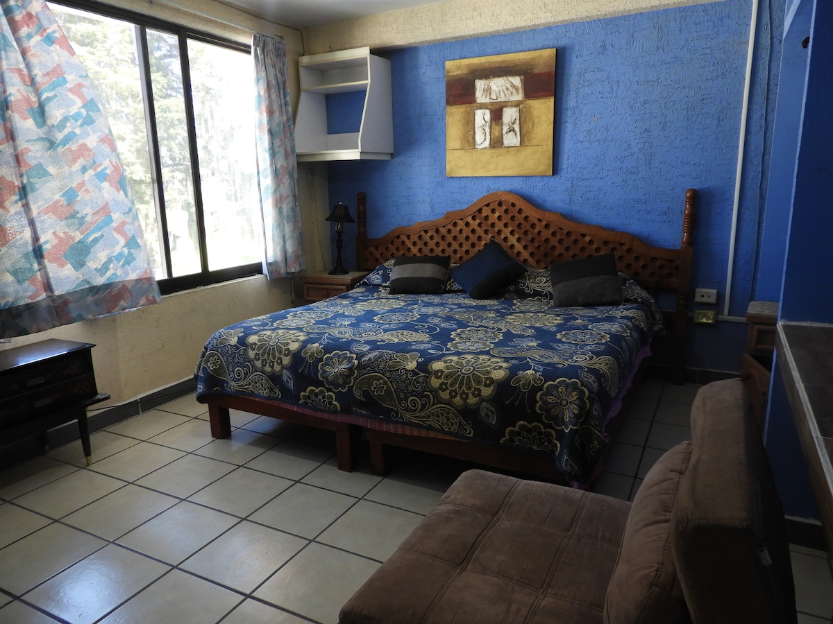 Nuestro personal se caracteriza por estar en todo momento dispuesto a brindar la hospitalidad, que nuestros huéspedes merecen. NUESTRA HABITACIÓN CUENTA CON: * 1 cama king size. * baño privado. * Limpieza de Habitación * Internet ampliado para brindar un mejor servicio. * Cocina compartida donde podrás preparar y consumir tus alimentos. * Seguridad Privada las 24 hrs. * Terraza para relajarse. * contamos c/ convenio de estacionamiento c/ costo preferencial para huéspedes.