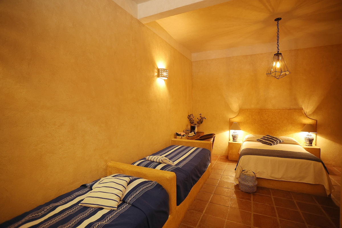 A charming and comfortable room, designed with the character of traditional Mexican haciendas. It offers all the amenities for up to 4 guests: 1 double bed and 2 single beds. Television, Wi-Fi, coffee maker, and a fully equipped bathroom. Hotel Oviedo is located within the Campestre Teotihuacan Club, 15 minutes from the pyramids and 2 minutes from the balloon port. By a lake, it features gardens, restaurant, gym, a swimming pool, massages, sports courts, a picnic area, and endless activities.