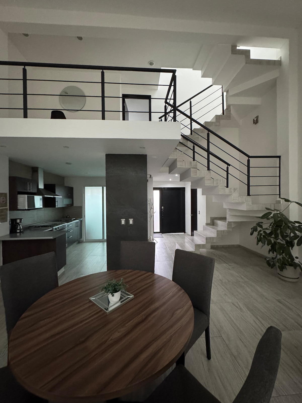 Alojamiento completo en una sola planta con 2 recámaras, 3 camas, 1 sofacama, 2 baños completos. Cocina totalmente equipada. Cochera para un auto con portón eléctrico. Ideal para ejecutivos Excelente ubicación. A 15 minutos del centro, a 13 minutos de angelópolis y a 10 minutos de Cholula, pueblo mágico. Si viajas de trabajo se encuentra a 18 min del Parque industrial FINSA Pet friendly Sala de juntas y/o talleres equipada para máximo 15 personas (mesas, sillas, manteles, pizarrón, pantalla, TV)