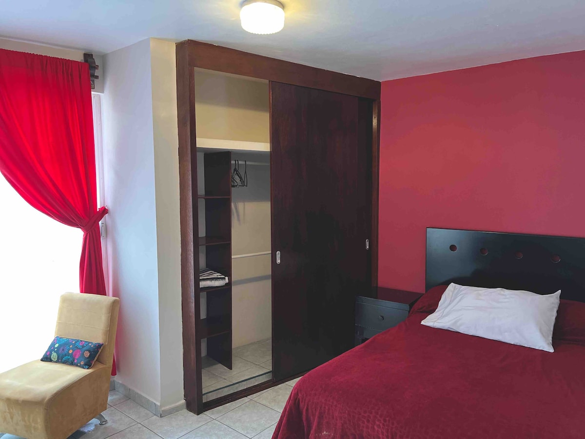 Visit Puebla staying in this quiet space in one of the best locations in the city. Spacious, independent, with private bathroom, walk-in closet, desk, dining space, stove, sink, microwave oven, refrigerator, WiFi, TV and fan. Close to Angelópolis Shopping Center, Estrella de Puebla, Museums, Art Park, Universities, Hospitals, Shopping, entertainment and restaurants. The neighborhood is semi-closed, quiet and guarded.