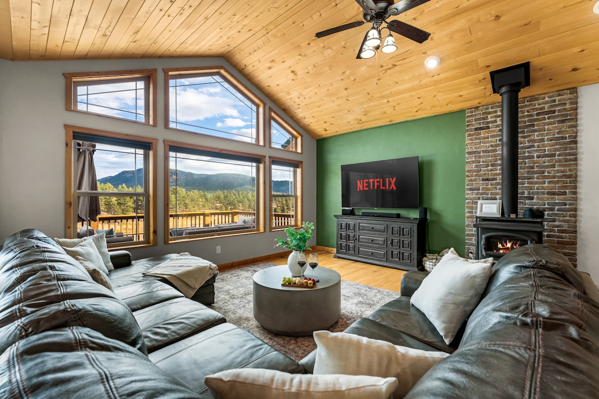 • Resort‑style setting with expansive decks, fire-pits, hammocks, and a hot tub, creating elegant indoor‑outdoor spaces for relaxing, connecting, and taking in the mountain air and night sky • Architecturally interesting contemporary mountain 4‑bedroom home sleeping up to 10 just 2 exits north of the US Air Force Academy and near 6+ wedding venues • Gourmet kitchen for effortless entertaining with plenty of room to gather and play games or head out for a hike on beautiful nearby trails.
