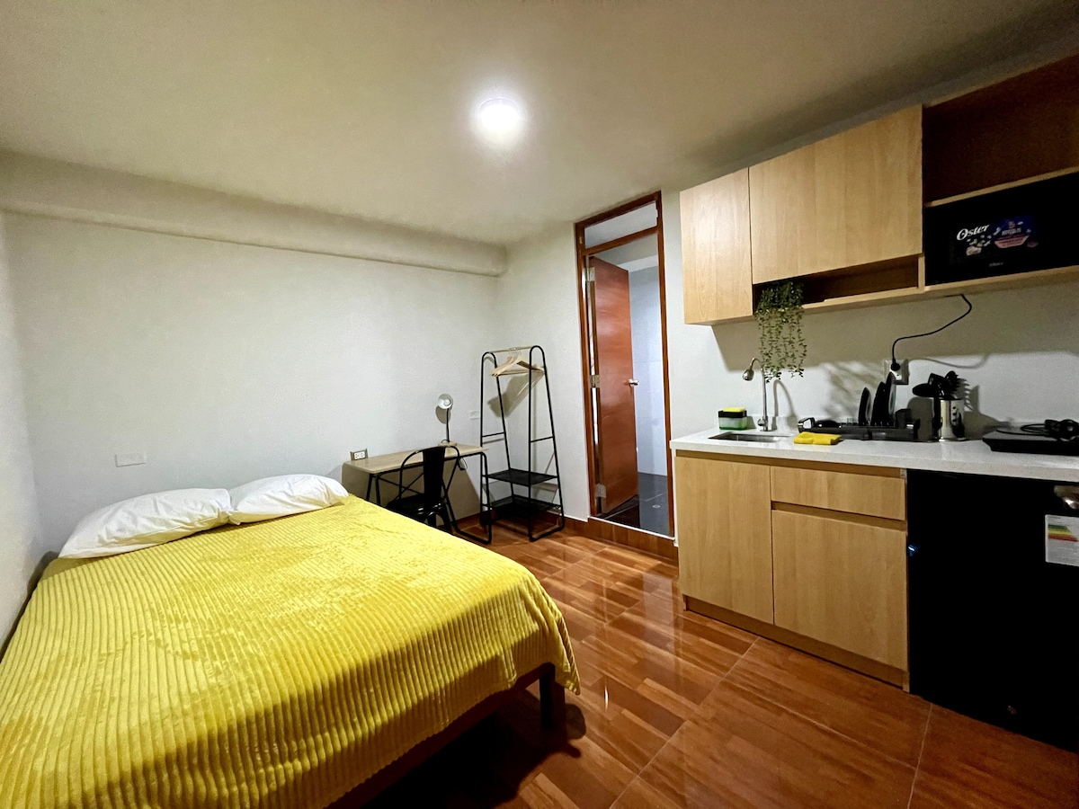 Mini depa con habitación, cocina equipada y baño privado. Entrada Independiente en edificio con Cámaras Exteriores. Remodelado, Iluminado y Ventilado, Cama 2 Plazas, TV Smart, Refrigeradora, Microondas y otros. Buena Ubicación a 10 minutos de la Universidad San Marcos, 8 de la PUPC y 5 de la URM, zona tranquila y céntrica rodeada de parques , cerca a Avenidas Principales, con múltiples líneas de Transporte. A 15 minutos de Plaza San Miguel, cerca a Museos, Supermercados y Diversos Restaurantes.