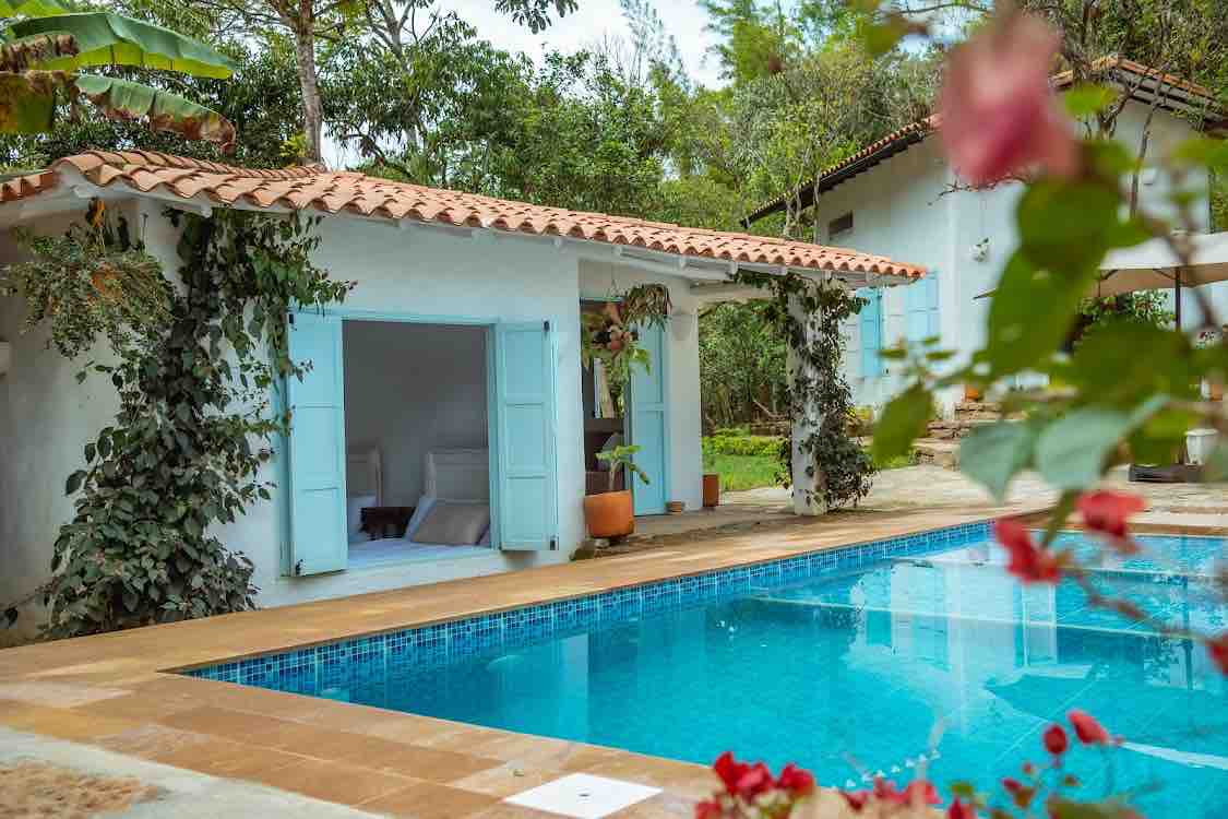 Spacious cabin for up to 8 guests in Puente Nacional. It has 2 bedrooms with private bathrooms, a social bathroom, and an extra shower by the pool. Includes 4 double beds, Wi-Fi, TV, kitchen with propane grill, and covered social area. Guests enjoy a private 7×4×1.2 m pool, showers with hot water, parking, and gated community. As part of Leyva Coffee Stay, visit Finca Casa Blanca for an authentic coffee experience. Short drive from Villa de Leyva and Ráquira.
