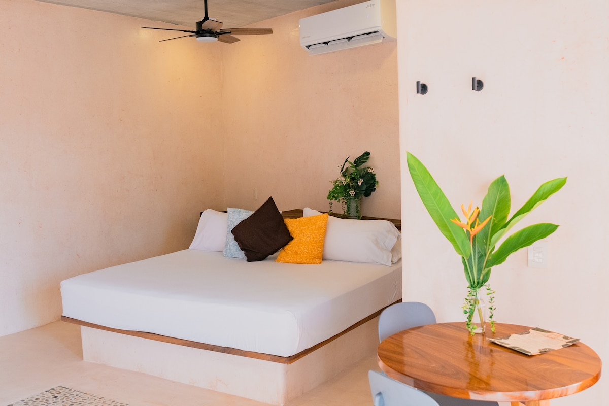Disfruta de una escapada relajante en esta acogedora cabaña tipo loft con vista al mar. A A solo 7 minutos caminando de la playa, este espacio es ideal para quienes buscan tranquilidad sin alejarse del sonido de las olas. El loft cuenta con una cama king size, aire acondicionado, baño privado con agua caliente, cocina equipada y una terraza perfecta para ver el atardecer o simplemente relajarte con una bebida. Perfecto para parejas que quieren conectar con la naturaleza sin sacrificar comodidad