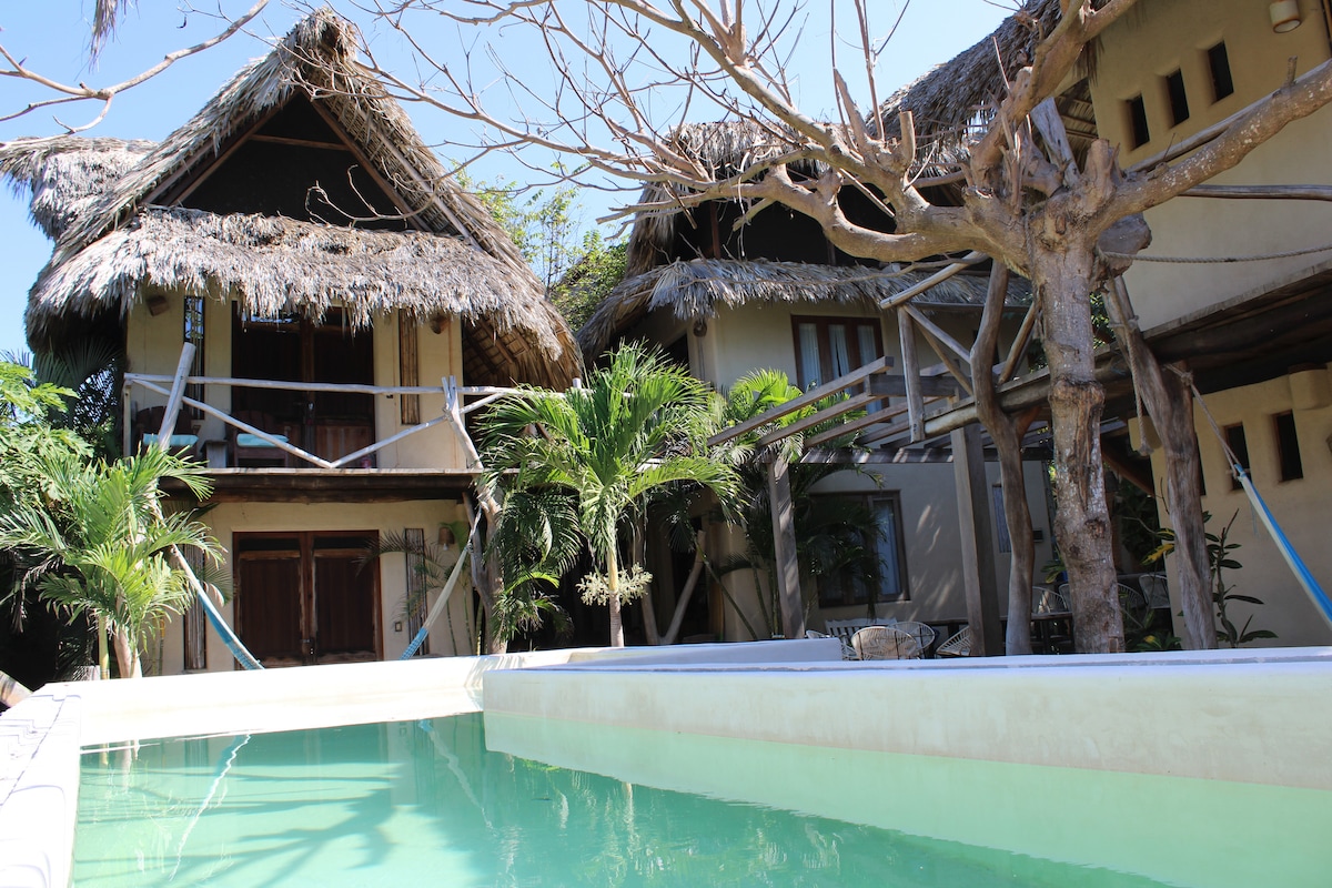 Bliss Haven is a retreat center for those who seek to practice a more mindful approach to life. With 9 well appointed lodgings and 1 dark meditation chamber we primarily offer long-term stays of 2 to 6 months. We are a 2 min walk to our favorite vegan places, Umami & Doba, and 5 min to the Hridaya Yoga Center and the beaches of Mazunte. This studio has a private balcony and hammock and is surrounded by a tropical garden with access to a clothing-optional pool, yoga hall & communal kitchen.