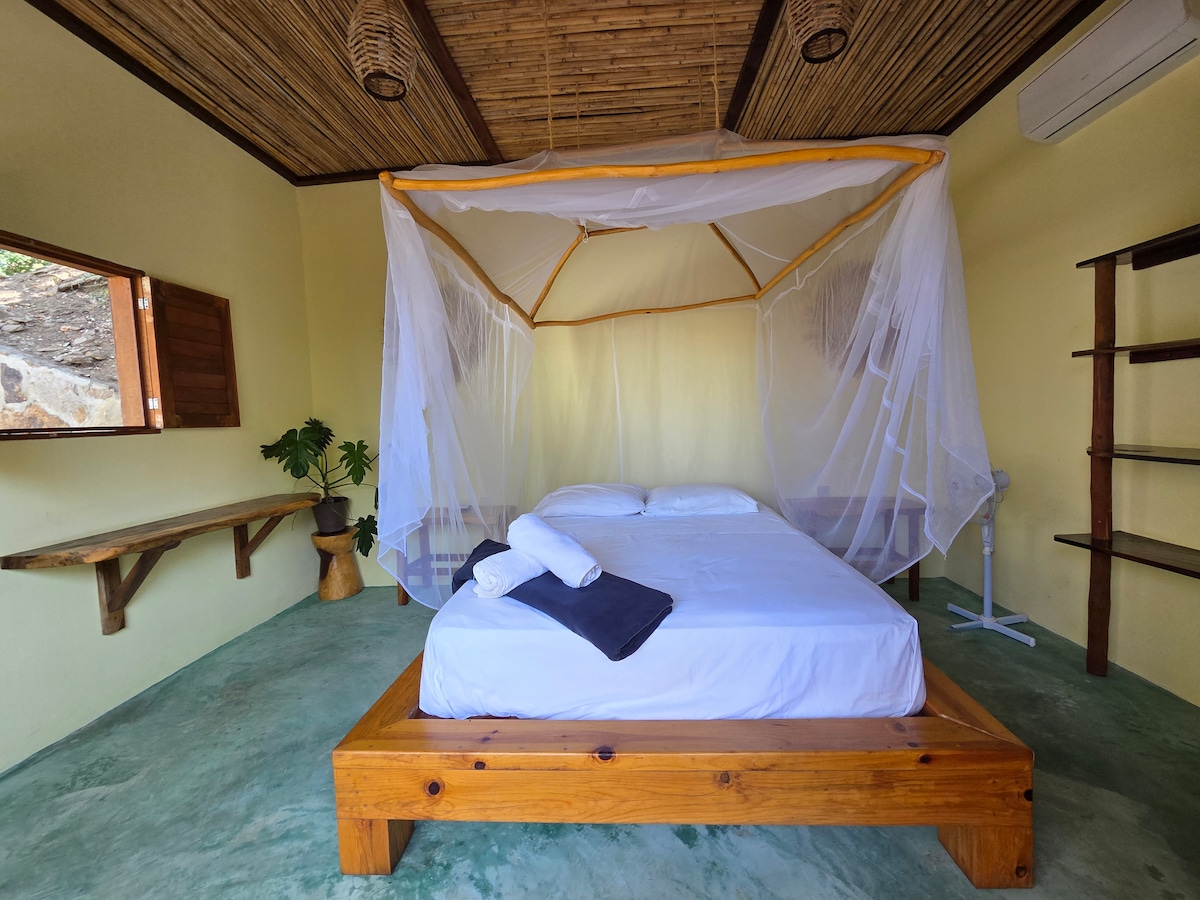 Cabañita ubicada en un segundo nivel con wc privado y regadera compartida FUERA DE LA HABITACION, con vistas al jardín, cama matrimonial con mosquitero, wi-fi Starlink gratis, ventilador, caja de seguridad y un esmerado servicio de limpieza diario.. Tenemos estacionamiento gratis a disponibilidad. El hotel se encuentra en primera línea de playa y cuenta con un restaurante-bar-cafeteria (Verifica sus horarios, gracias)