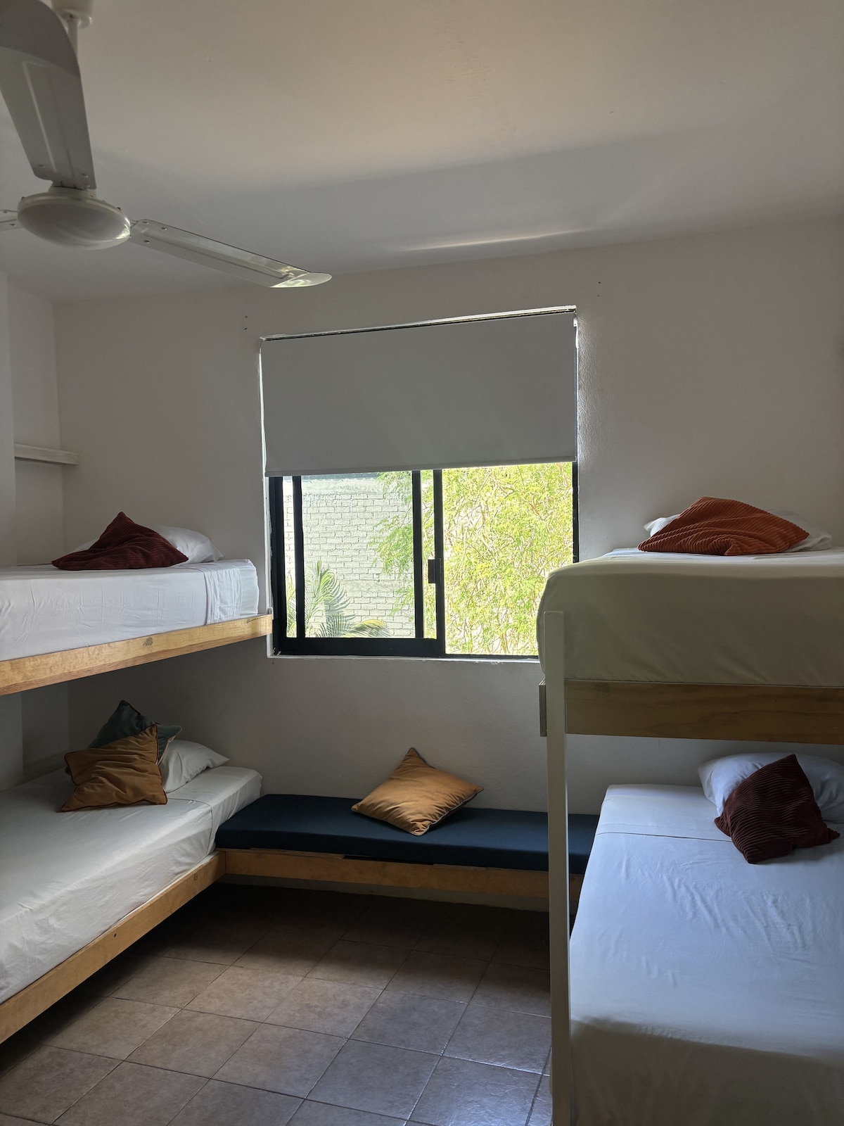 La habitación doble está en planta baja, ofrece un espacio cómodo, fresco y tranquilo, ideal para descansar o trabajar remoto. Su diseño boho-tropical, crea una atmósfera relajante perfecta para una estancia agradable. Cuenta con 2 camas queen size, A/C, ventilador, TV, WiFi, baño privado, frigobar, cafetera Nespresso y barra de cocina. Como huésped podrás disfrutar de las áreas comunes como la alberca, salón de coworking, sala de estar, cocina equipada y circuito de vigilancia.
