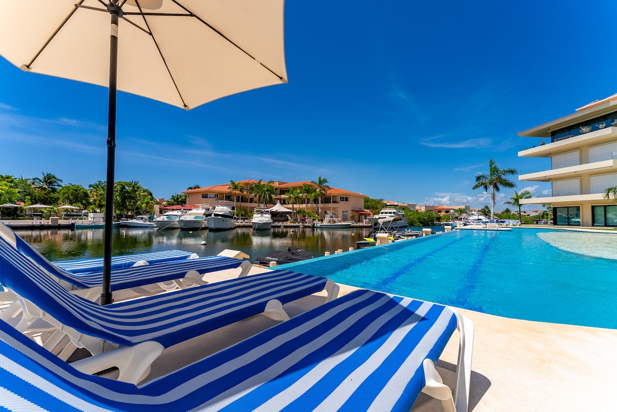 Enjoy a luxury experience in this ground-floor, marina-front apartment with direct access to the infinity pool and a private terrace perfect for relaxing in the hammock or grilling outdoors. Inside, you’ll find spacious modern design, a fully equipped kitchen, a master suite with a king bed, and a second bedroom with two double beds. Ideal for families, couples, or remote work, with high-speed WiFi and the safety of Puerto Aventuras.
