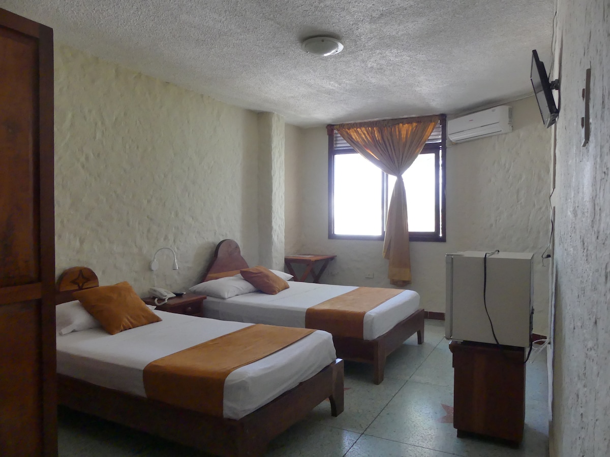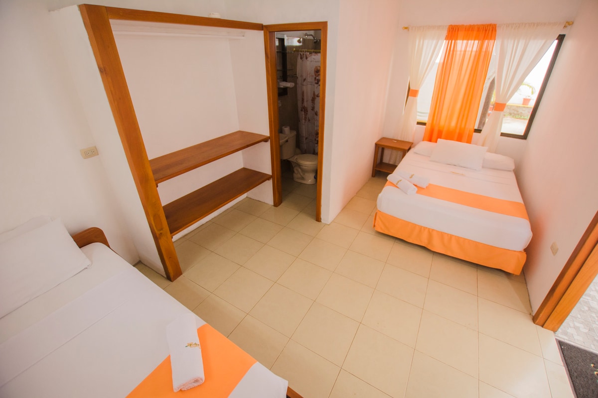 Linda habitación privada ideal para grupos de amigos o familia. Habitación amplia y cómoda con aire acondicionado y TV con cable y productos de higiene biodegradables. Puedes tomar sol junto a la piscina, disfrutar de un café Galapagueño o un cálido té y agua filtrada disponible para ti libremente en nuestra área social. Sera un gusto ser tus anfitriones y ayudarte en lo que necesites, nos encargaremos de hacerte sentir como en casa.