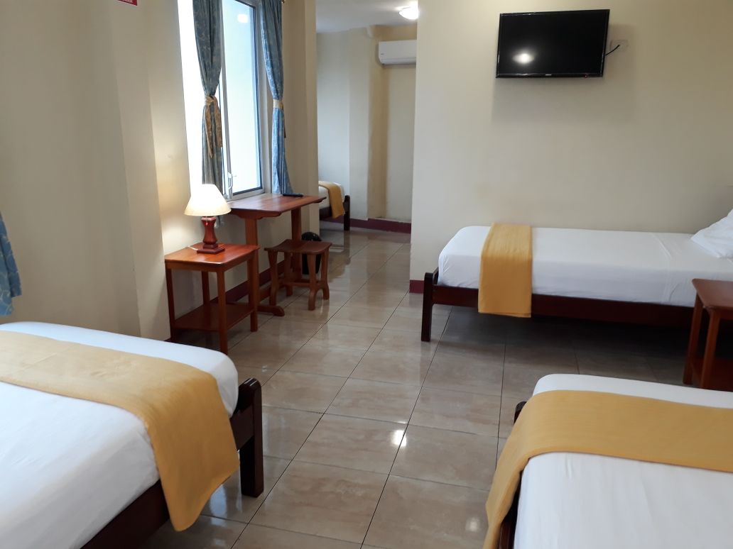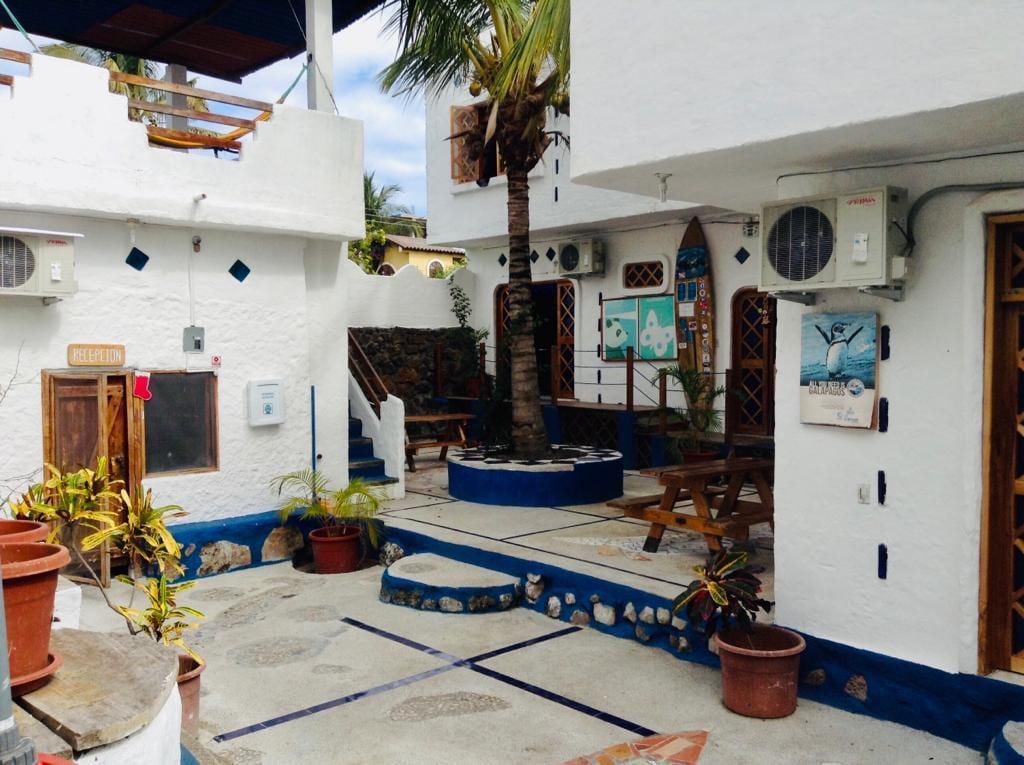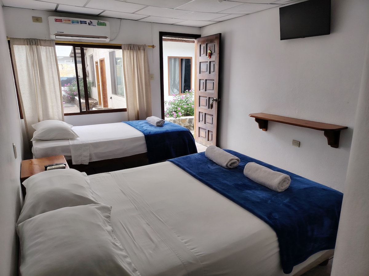 Habitación en segunda planta. La habitación cuenta con 2 camas Queen, aire acondicionado, baño privado con agua caliente y secador de cabello. Disfruta de nuestra piscina luego de tus actividades turísticas. Te brindamos agua filtrada, te y café Galapagueño free 24 horas, disponible cundo lo necesites. Nuestras tarifas no incluyen 15% IVA, por favor si eres de ECUADOR y requieres Factura comunícate con nosotros antes de confirmar tu reserva.