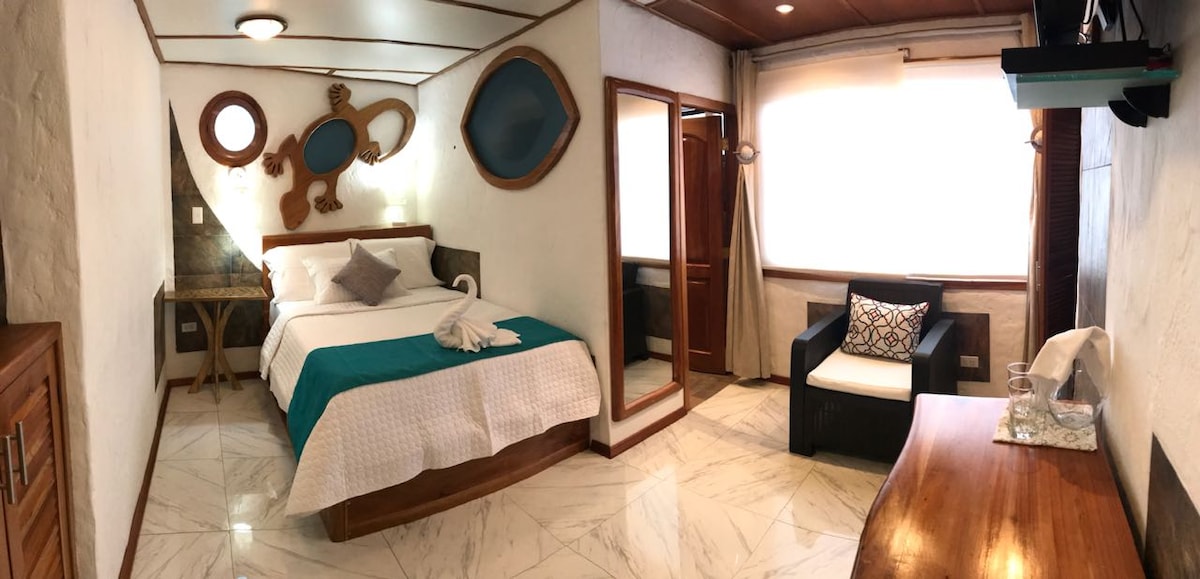 Disfruta de una habitación amplia y elegante, ubicada en la planta alta, con una hermosa terraza ideal para relajarte al aire libre. El espacio combina comodidad y estilo, creando un ambiente acogedor para tu descanso. A tan solo 5 minutos caminando de la entrada de Tortuga Bay y a 7 minutos de la Estación Charles Darwin, estarás rodeado de la belleza natural y cultural de Galápagos. Una escapada perfecta para quienes buscan tranquilidad, confort y una ubicación privilegiada.