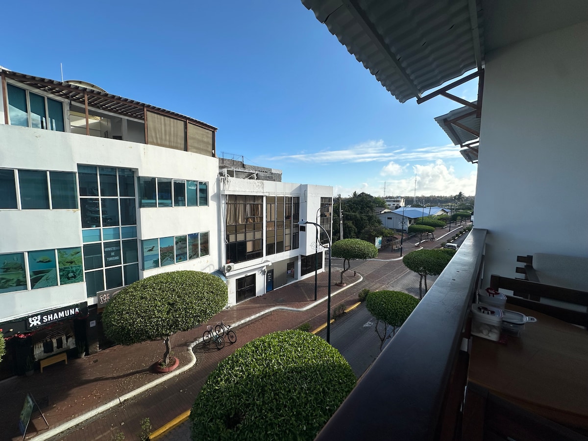 Ubicado en la terraza de uno de los edificios más altos de la isla, encontrarás una maravillosa vista todo el día. Muy fácil de localizar, en av. principal Baltra. Rodeado de restaurantes, tiendas y cajero automático Banco Pichincha cruzando la calle. A 4 cuadras de Terminal Terrestre y 3 cuadras de Mercado Municipal y parada de bus a zonas rurales. Privacidad en tu propia terraza abierta equipada con elementos para ejercitar, comedor y cocina con utensilios. Perfecto para reuniones.