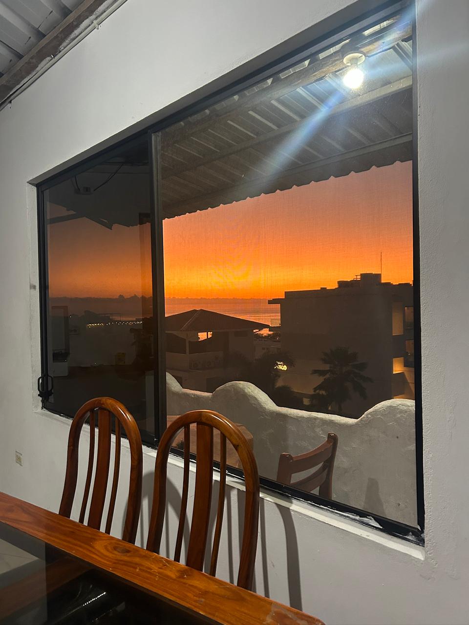 This ocean view apartment is located in the center of town, at the top of a 4th floor building-- three blocks/5-minute walk from the main waterfront and a 3-minute walk to the farmer's market and affordable food court. This fully-furnished apartment includes a stocked kitchen (fridge, oven, stove, coffee maker, blender, pots & pans, etc.), dining/living room, separate bedroom and bath, and a private balcony with hammocks and seating to view Puerto Baquerizo harbor's stunning sunsets.