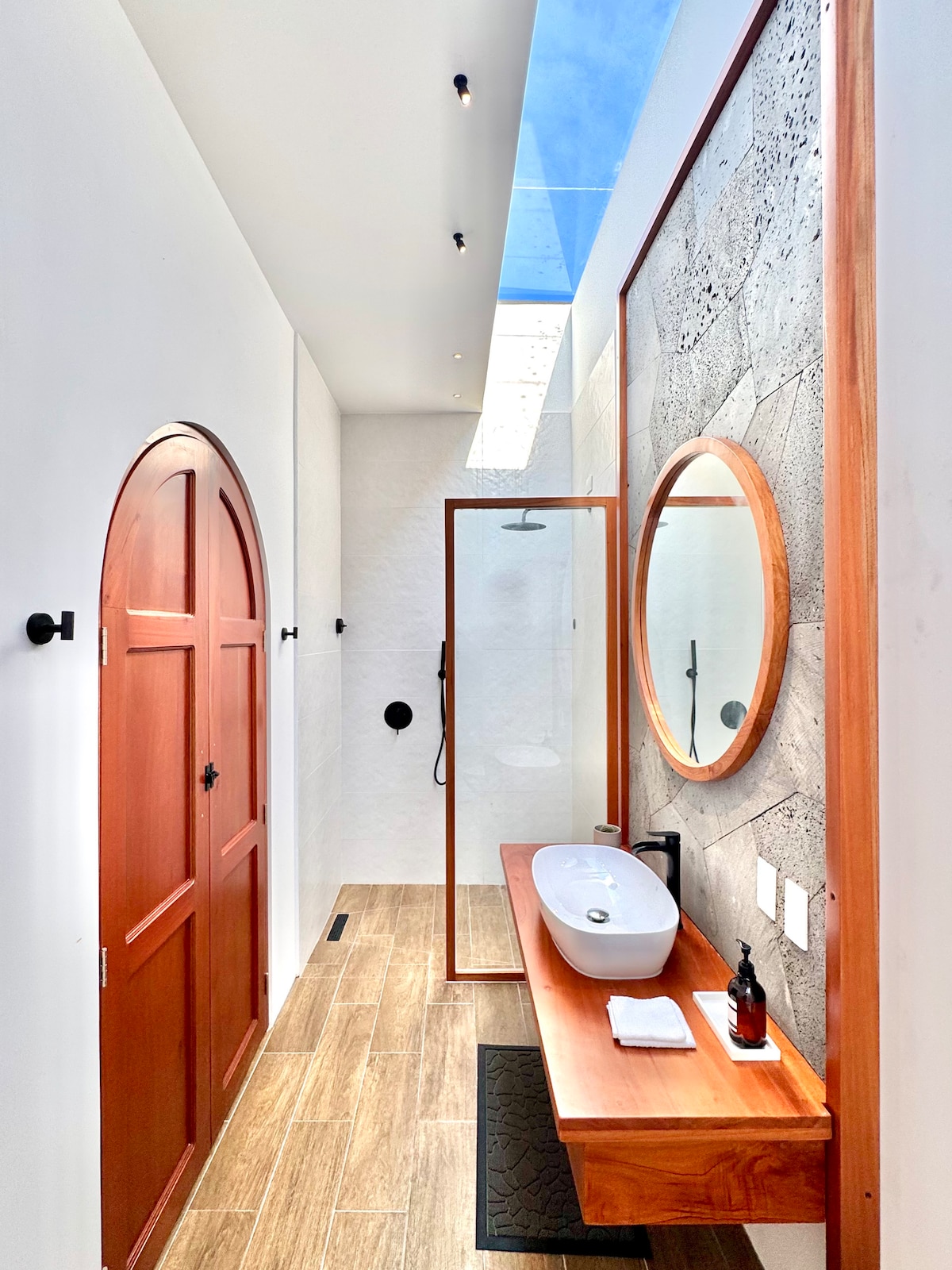 Aquí el tiempo baja el ritmo. La piedra chuleta, lava volcánica de Galápagos, se combina con madera natural, arcos suaves y luz cálida para crear un espacio sereno y acogedor. Un refugio íntimo para dos, pensado para descansar, leer, cocinar sin prisa y habitar la calma.