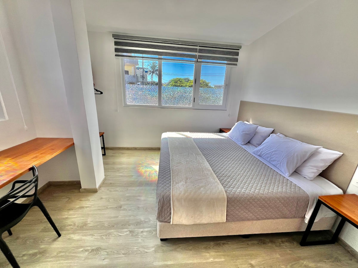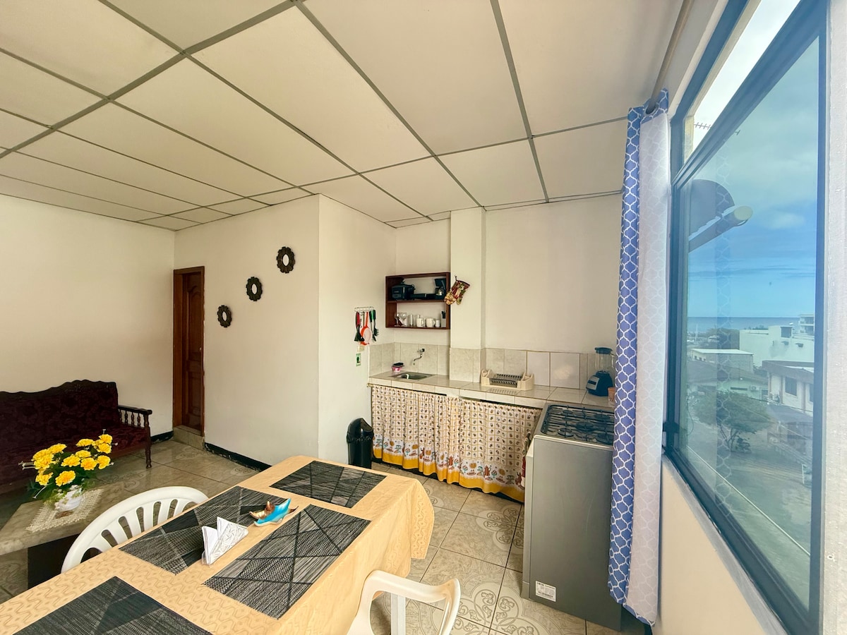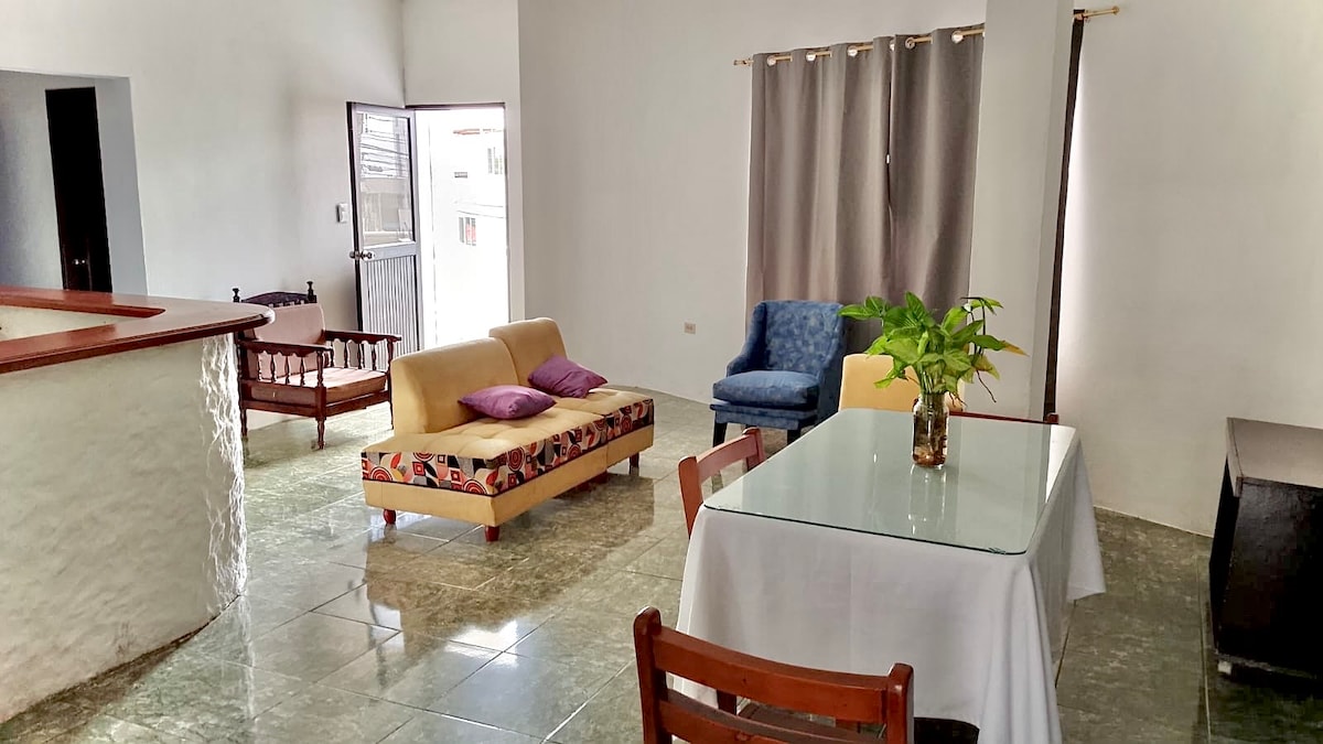 Spacious and comfortable apartment on the second floor, located in the center of San Cristóbal, just two blocks from the waterfront. Perfect for solo travelers, couples, or short families. Close to restaurants, bakeries, and pharmacies, with all essentials for a practical and pleasant stay.