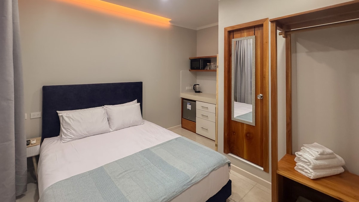 Cómodo y acogedor apartamento renovado con 2 habitaciones, cada una con baño privado, aire acondicionado, camas y colchones a estrenar y cortinas black-out para un descanso total. Incluye un sofá cama para un huésped adicional y una cocina equipada con utensillos basicos para uso diario. A pasos del centro, a solo minutos caminando del muelle de pasajeros en donde podrás encontrar restaurantes, tiendas y hermosos paseos frente al mar.