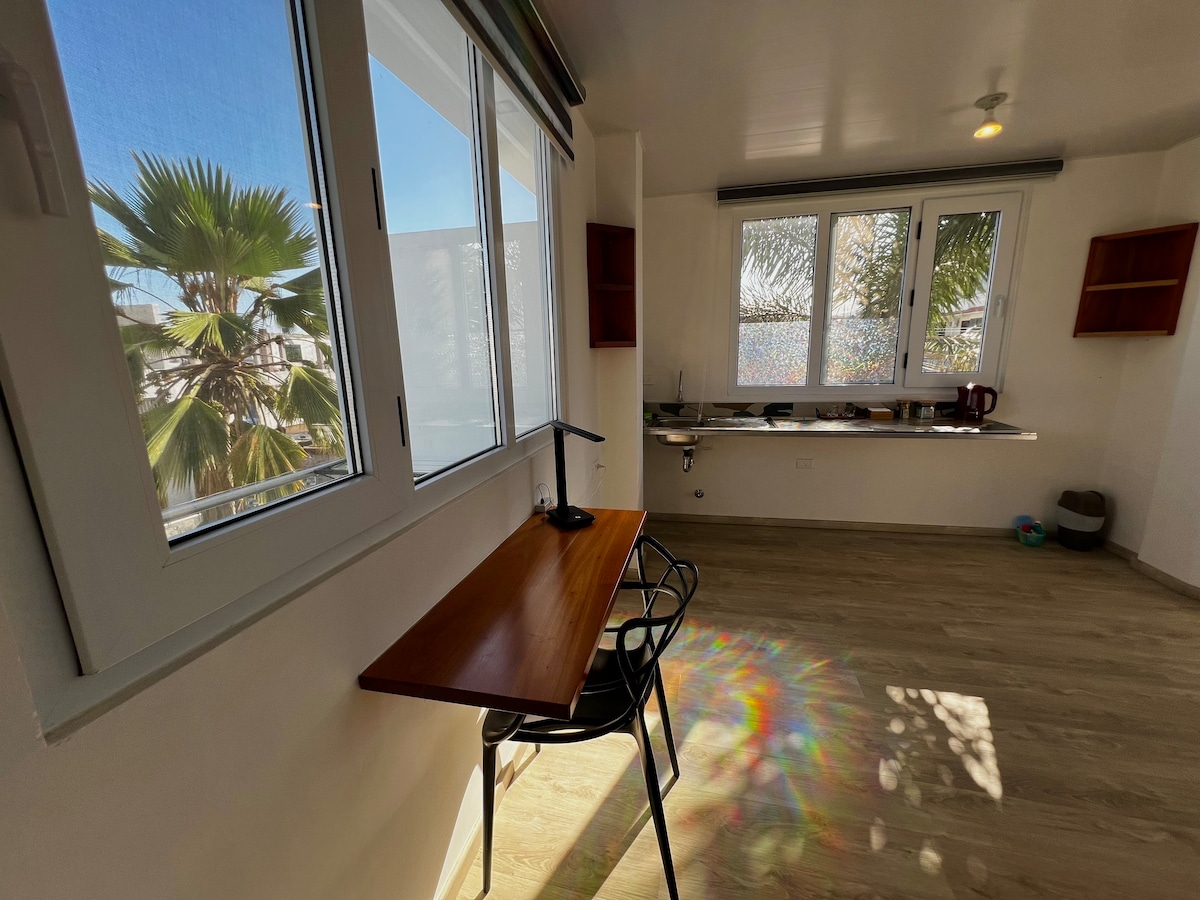 Dispongo de una mini suit en un primer piso la habitación muy comoda bonita con un pequeño balconcito a la parte de atrás de la casa pero también se puede observar parte de las calles es muy intima perfecta para disfrutar o trabajar a 10 minutos del aereopuerto y de las playas cerca de todo
