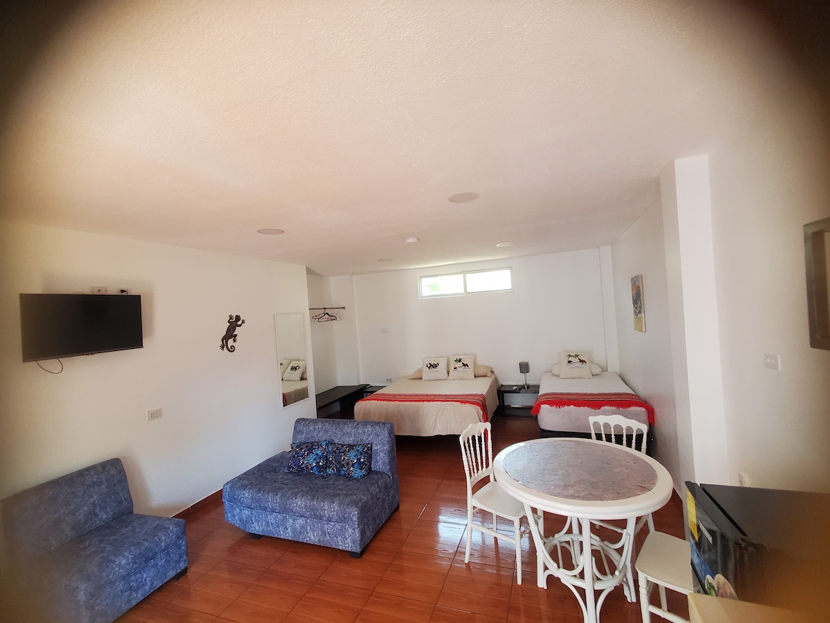 Suite en ubicación privilegiada a 7 minutos caminando del muelle Baquerizo Moreno, en barrio dentro del centro poblado de la isla San Cristóbal. Para turistas que buscan sentirse en casa, con todas las comodidades para estadías largas. Moderna, luminosa con ventanales, amplia, privada y fresca, con aire acondicionado y ventiladores de techo y 3 baños completos privados (por c/habitación), terrazas exteriores techadas, hamacas, wifi, lavadora, secadora, incluye garrafón de agua para consumo y más