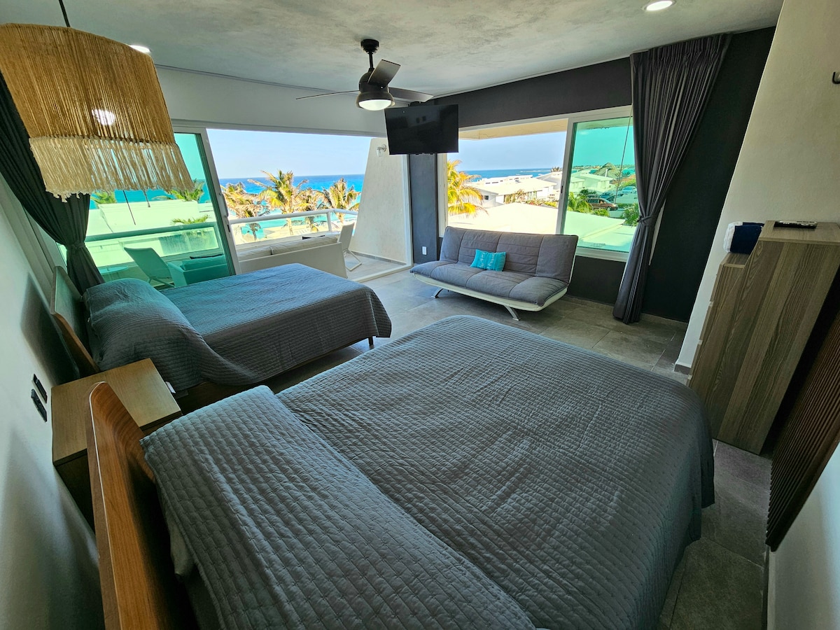 Estudio con vista al mar, ubicado en segundo piso; forma parte de un alojamiento vacacional frente a mar (no es un hotel) en una zona tranquila. La playa más cercana está a diez minutos caminando. Es ideal para parejas, familias o grupos pequeños de amigos. A menos de 5 minutos a pie de la estación del ferry que va hacia Isla Mujeres. No se permiten fiestas ni invitados, sólo el número de huéspedes indicados en la reservación. Es una experiencia local.