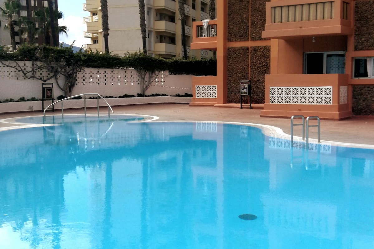 Tropical inspired décor, very bright and modern vacational rental in a 8th floor. Literally within 30 seconds from the beach. In line with a magnificent ocean view as well as a splendid view of Teide volcano from a furnished balcony terrace. A wonderful studio with 1 double bed and 1 sofa-bed. Washing machine, fiber optic wifi network (600Mbps).Close to all amenities including 24h concierge service at hall, tennis court,2 high rise pool solarium,1 big pool,outdoor gym.