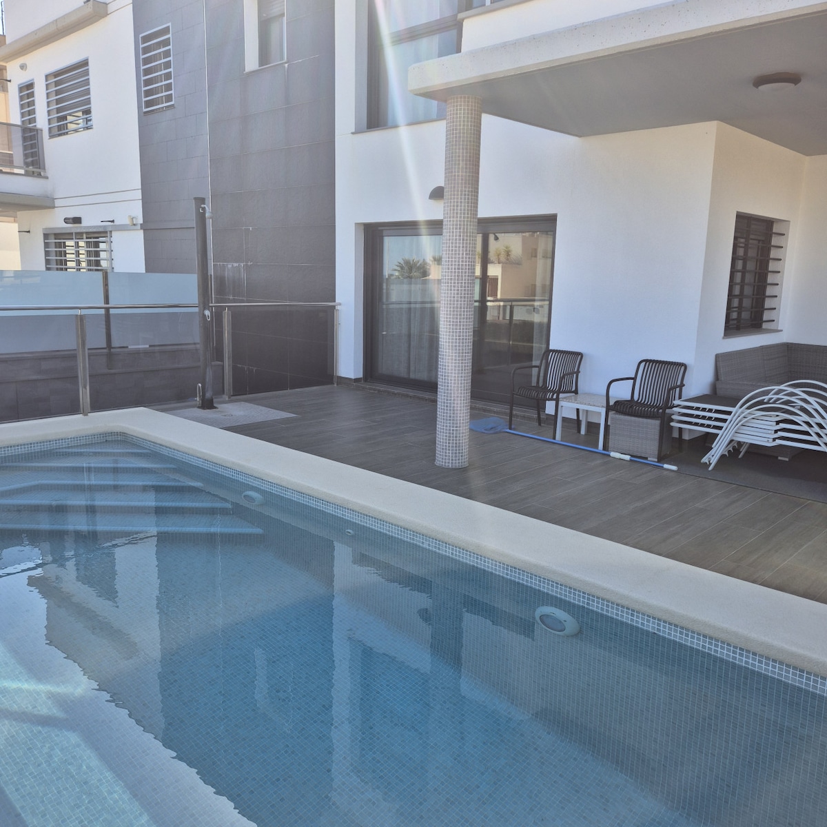 Immerse yourself in Serena del Mar, a luxurious and well-equipped villa with a private pool + Jacuzzi, plenty of outdoor space and a modern, colourful design. The property stands out for its spaciousness, brightness and comfort. It is perfect for families or couples who want to enjoy a clean, warm and spacious yet cosy space. Immerse yourself in what could be your temporary home, close to the beach, the town centre and just 20 metres from a Mercadona supermarket. Comfort at its finest.