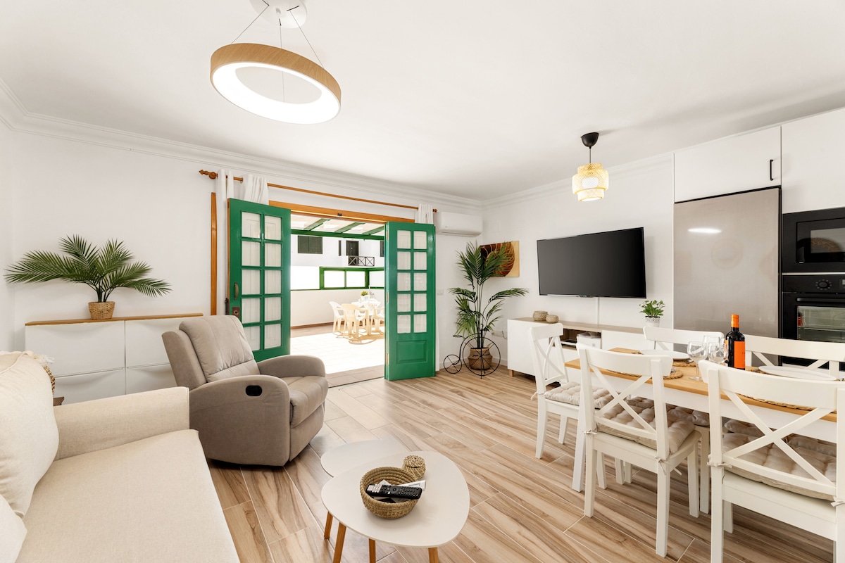 Cosy and peaceful independent apartment, not part of a resort, well located in a residential part of Puerto del Carmen. It is only a 1 minute walk to the main avenue and the beach. You are staying in a quiet area surrounded by palm trees and vegetation. Restaurants, supermarket, shops and entertainment are located nearby. Small and bigger sand beaches are all within walking distance. Bus stops are around the corners as well.