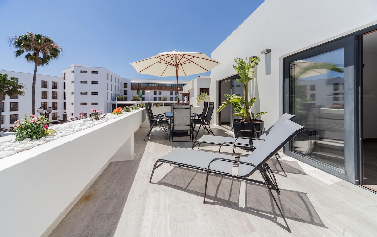 🇬🇧 One-bedroom ground floor holiday apartment with a fully equipped kitchen and a spacious terrace with outdoor dining and peaceful garden views. It includes fast Wi-Fi and TV channels. The complex features two swimming pools, a children’s playground, and free parking. Located just a 5-minute walk from the beaches and 10 minutes from Costa Teguise centre.
