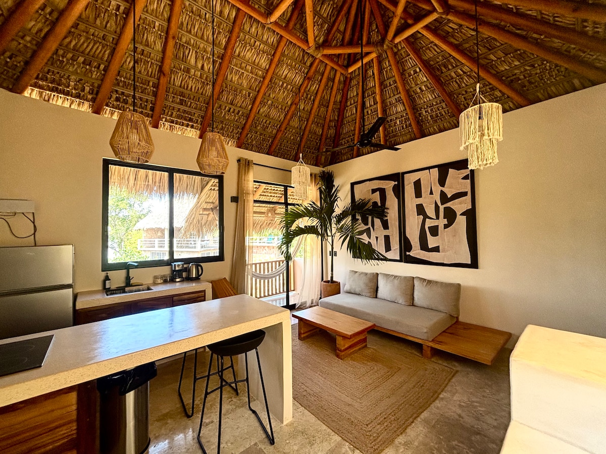 Acogedora suite con cama Queensize, Smart TV, Aire acondicionado, ventilador de techo, cocina, baño y jacuzzi privado. Disfrute de los atardeceres y relaje su mente mientras contempla la vista panorámica de la ciudad, el océano y las montañas desde su jacuzzi privado. Nos encontramos en Punta Zicatela, a 7 minutos caminando de la playa, principal punto de surf, restaurantes, bares y zona comercial. Cerca de todo, pero fuera del bullicio de la fiesta. Contamos con Internet Starlink.