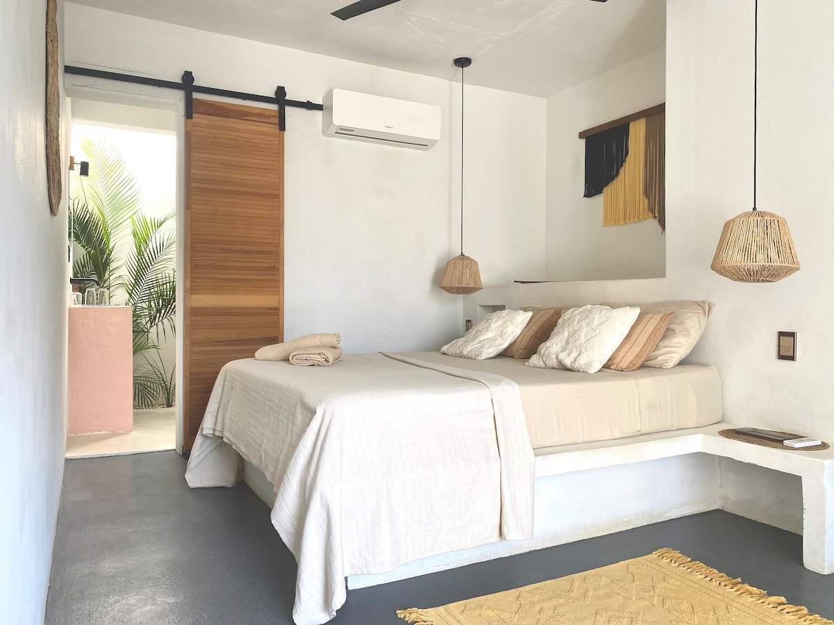Discover the magic of Punta Zicatela in this minimalist, adults-only retreat. We welcome you with spacious rooms featuring private terraces and hammocks. Unwind by the pool, an exclusive oasis reserved just for our guests. Each room is equipped with Starlink Wi-Fi, air conditioning, fan, Nespresso machine, mini refrigerator, and a safe. Located just a 7-minute walk from the beach and 2 minutes from public transportation, you can easily explore stunning destinations like Zipolite and Mazunte.