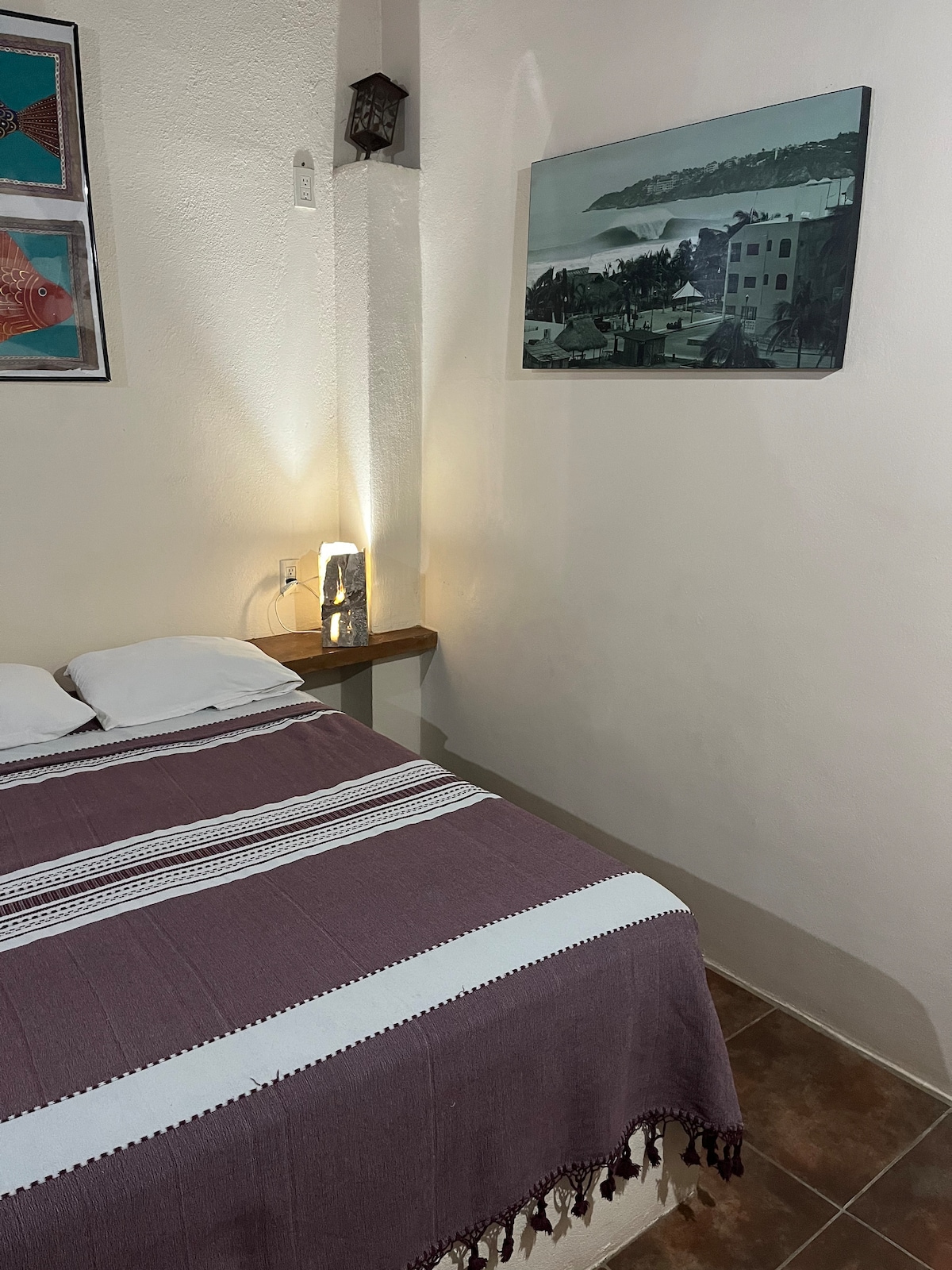 Ubicado en la Punta Zicatela cerca de la playa, escuelas de surf, bares y restaurantes. Perfecto para descansar o trabajar, con un excelente Wifi de fibra óptica y Starlink. Ubicado en planta baja, frente al jardín, tiene cama queen, AC, baño completo, cocineta con utensilios básicos (frigo, parrilla, cafetera, tetera eléctrica, filtro de agua) y un pequeño desayunador con vista al jardín. Tiene un pequeño jardín lateral con hamaca.