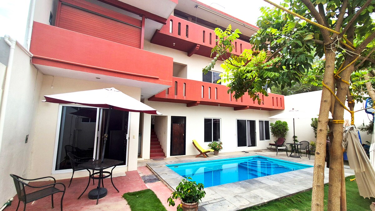 Depa amplio y luminoso en planta alta con 2 camas queen súper cómodas, A/C en la recámara y ventiladores en sala y cocina. Cuenta con cocina equipada, salita acogedora y balcón con vista a palmeras. Estás a solo 2 min de la playa y a 1 min de cafés, tiendas y restaurantes. Disfruta el patio compartido con hamacas, árboles frutales, asador y área de pesas artesanales. Ideal para relajarte, surfear o trabajar remoto con buena vibra.