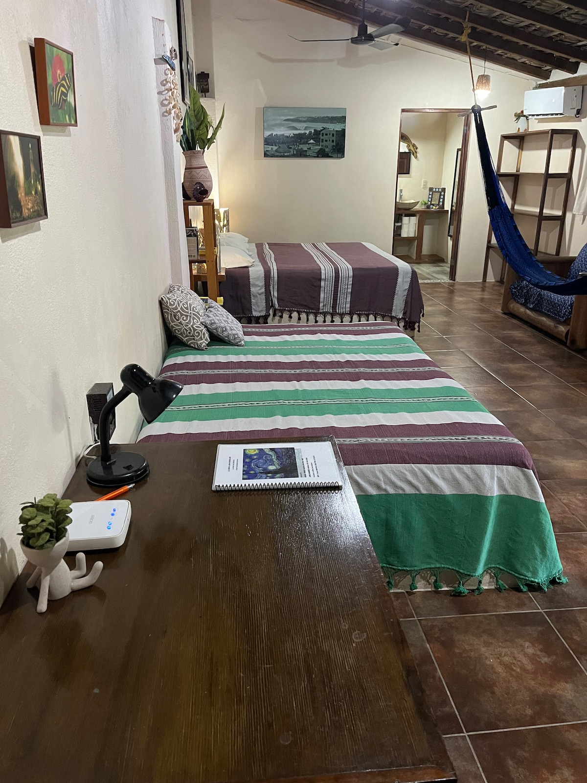 Relájate en esta amplia habitación con 2 camas matrimoniales y baño privado. Disfruta de una pequeña alberca y una terraza compartida con vista al mar, perfecta para ver el atardecer o leer un libro. Estamos a solo 3 minutos caminando de la playa y a 5–10 minutos de los mejores bares y restaurantes de Zicatela. Ideal para desconectar y sentir la vibra de Puerto Escondido.