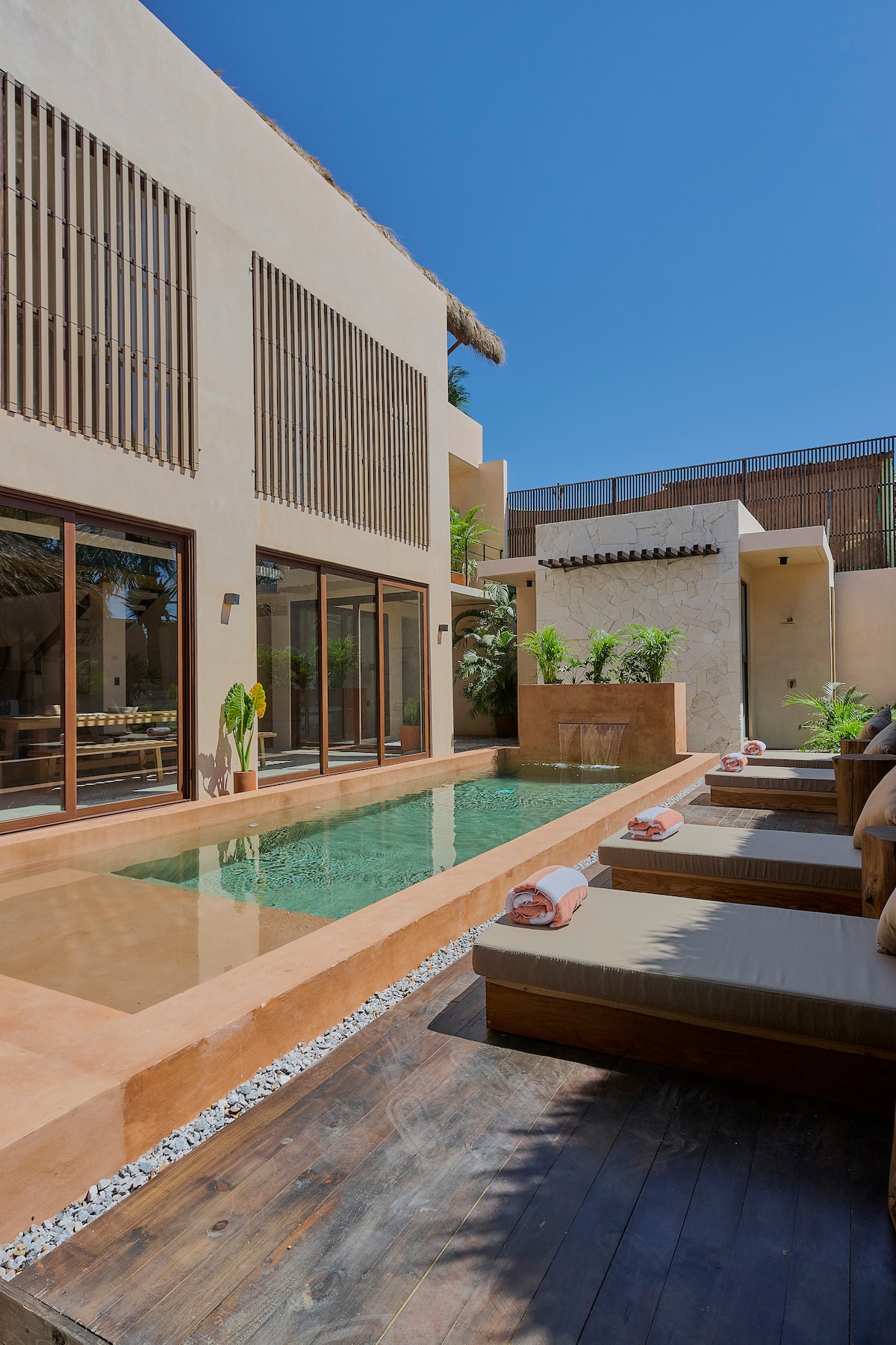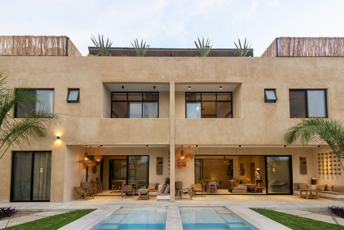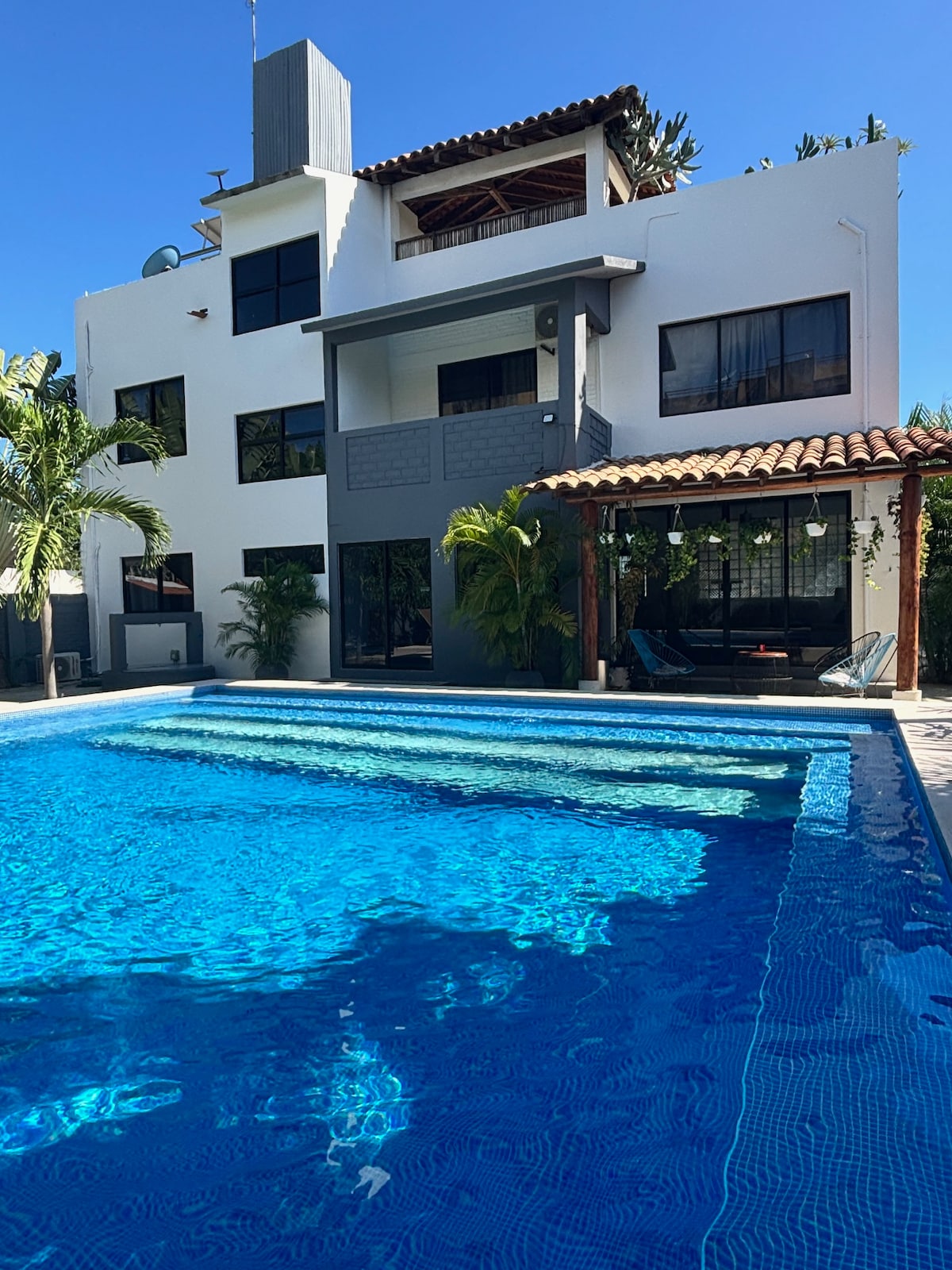 CASA TSUKI, totalmente privada, a 5 minutos de la playa, vista al mar. -WIFI de alta velocidad -4 recamaras con baño completo y aire acondicionado de última generación -5 camas, 2 sofás, la principal con sala grande integrada en el mismo espacio con balcón y gran terraza con otra sala. -Comedor, cocina y gran sala en planta baja -Alberca única en su diseño y tamaño -Palapa en espectacular terraza con sala y cocineta -Garaje para 2 autos -Bodega, sistema de seguridad y Smart TV.