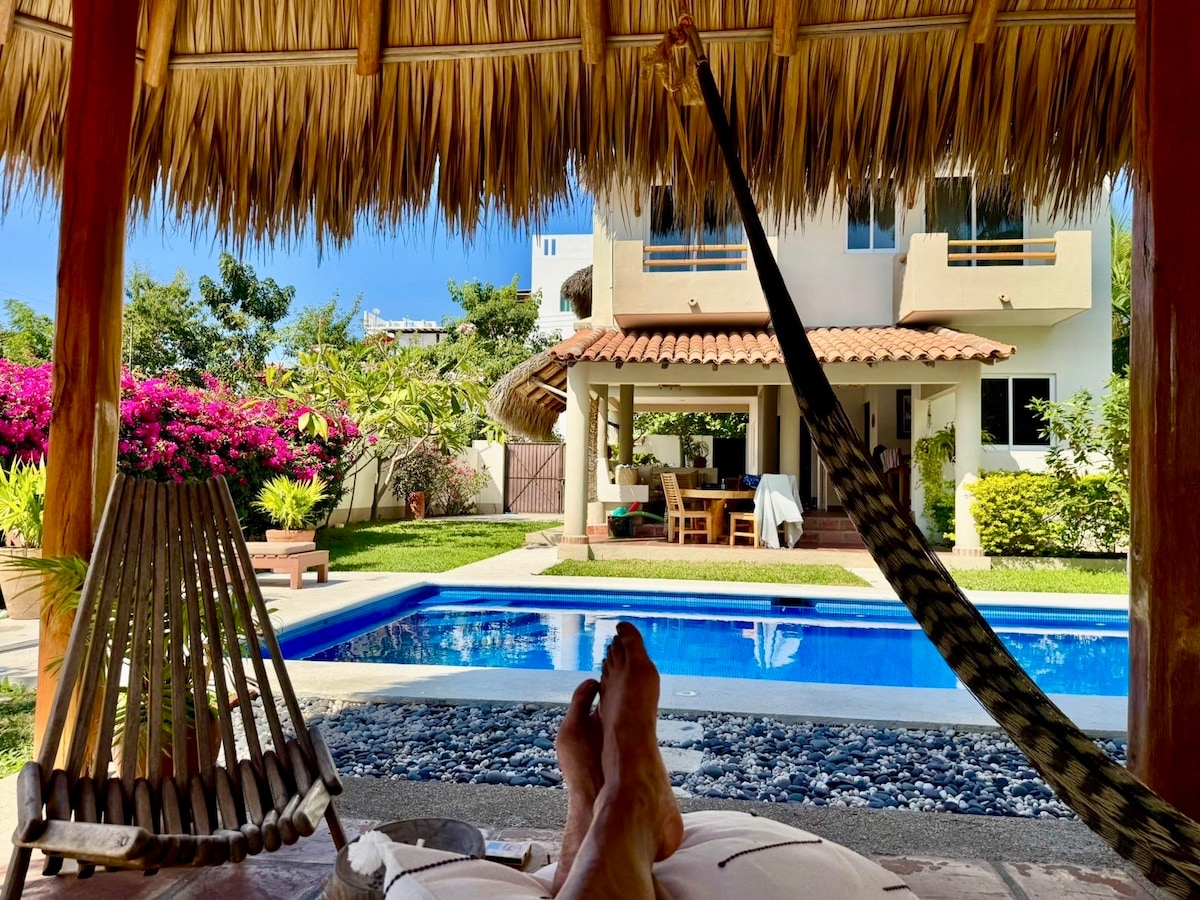 Hermosa casa privada en Punta Zicatela estilo mexicano a cuatro cuadras de la playa. Capacidad para 8 personas. Cuenta con cuatro recámaras con baño completo cada una, terraza, ventilador, aire acondicionado solo en cuartos. En planta baja hay un cuarto tv con sofá cama, ventilador, baño completo, cocina, comedor y sala para 10 personas. Alberca con jardín, bar, sala, hamaca. Garaje para 1 auto interior y 2 en exterior. WiFi (Starlink) y Smart TV.