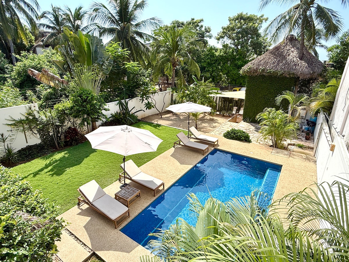 Casa Menta es un lugar cálido y acogedor, diseñado con amor para que vivas días de descanso y conexión. Ideal para familias y grupos que buscan relajarse, compartir y disfrutar. Lo que encontrarás en Casa Menta: – 6 habitaciones con aire acondicionado, baño privado y balcón. – Alberca rodeada de jardín para refrescarte y relajarte. – Terraza al aire libre y Salón Zipolite con A/C perfectos para compartir momentos únicos. – Cocina totalmente equipada para preparar tus comidas favoritas.