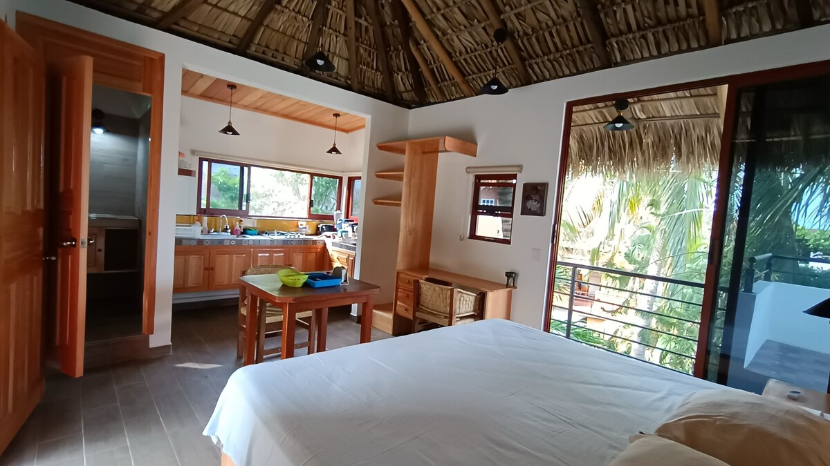 Acogedora suite con cama Queensize, Smart TV, Aire acondicionado, ventilador de techo, cocina, baño y jacuzzi privado. Disfrute de los atardeceres y relaje su mente mientras contempla la vista panorámica de la ciudad, el océano y las montañas desde su jacuzzi privado. Nos encontramos en Punta Zicatela, a 7 minutos caminando de la playa, principal punto de surf, restaurantes, bares y zona comercial. Cerca de todo, pero fuera del bullicio de la fiesta. Contamos con Internet Starlink.
